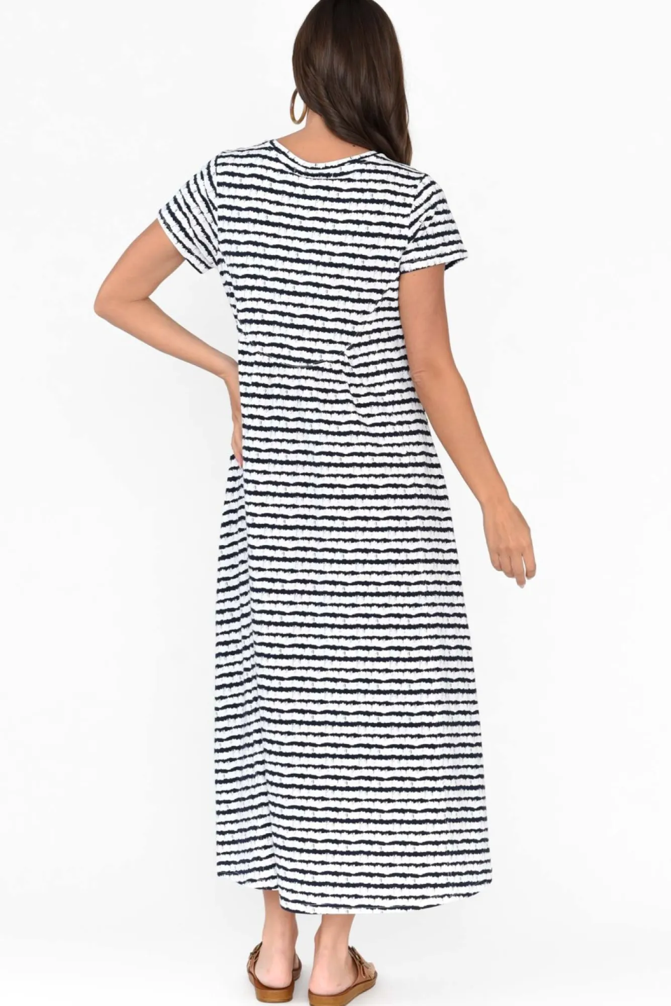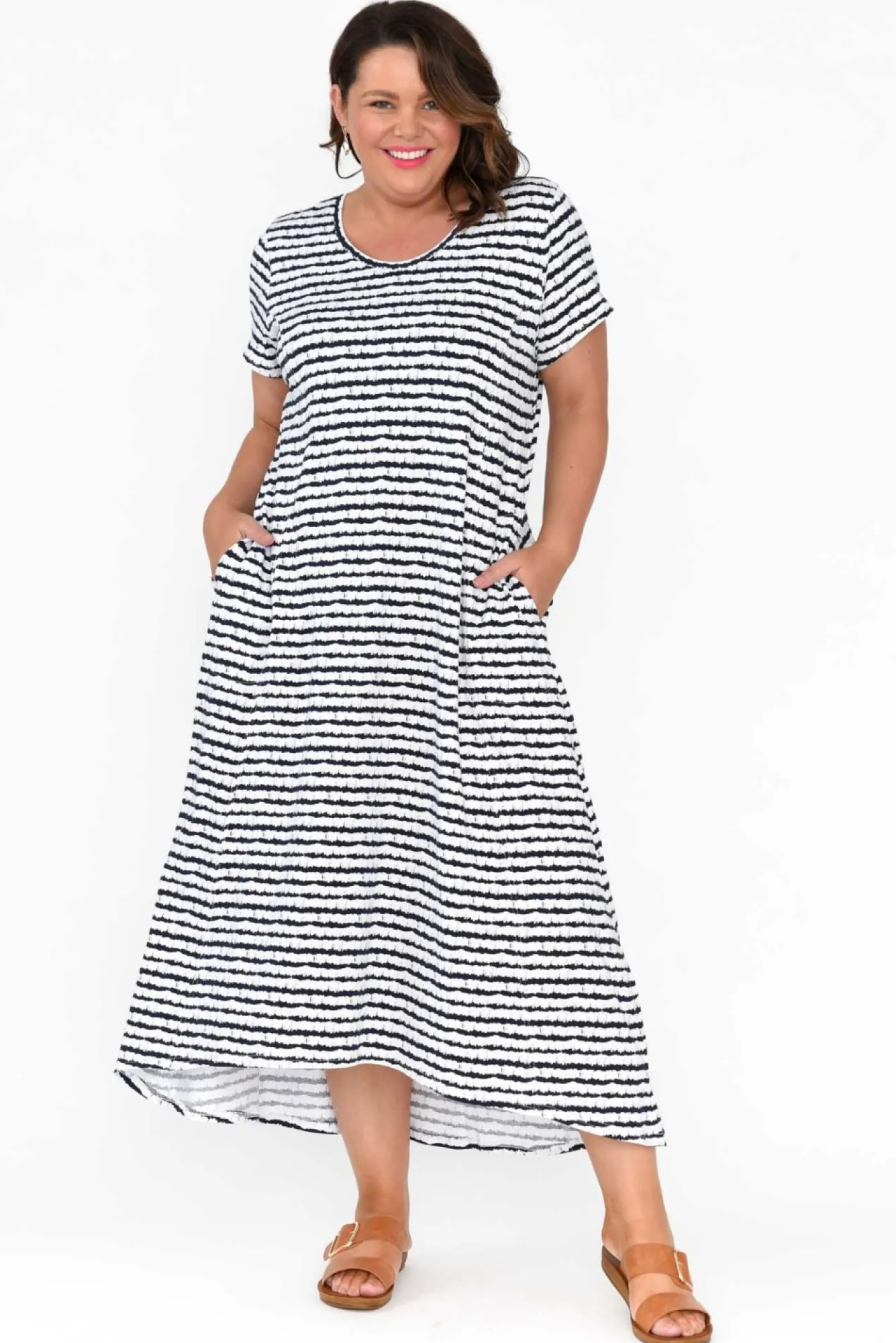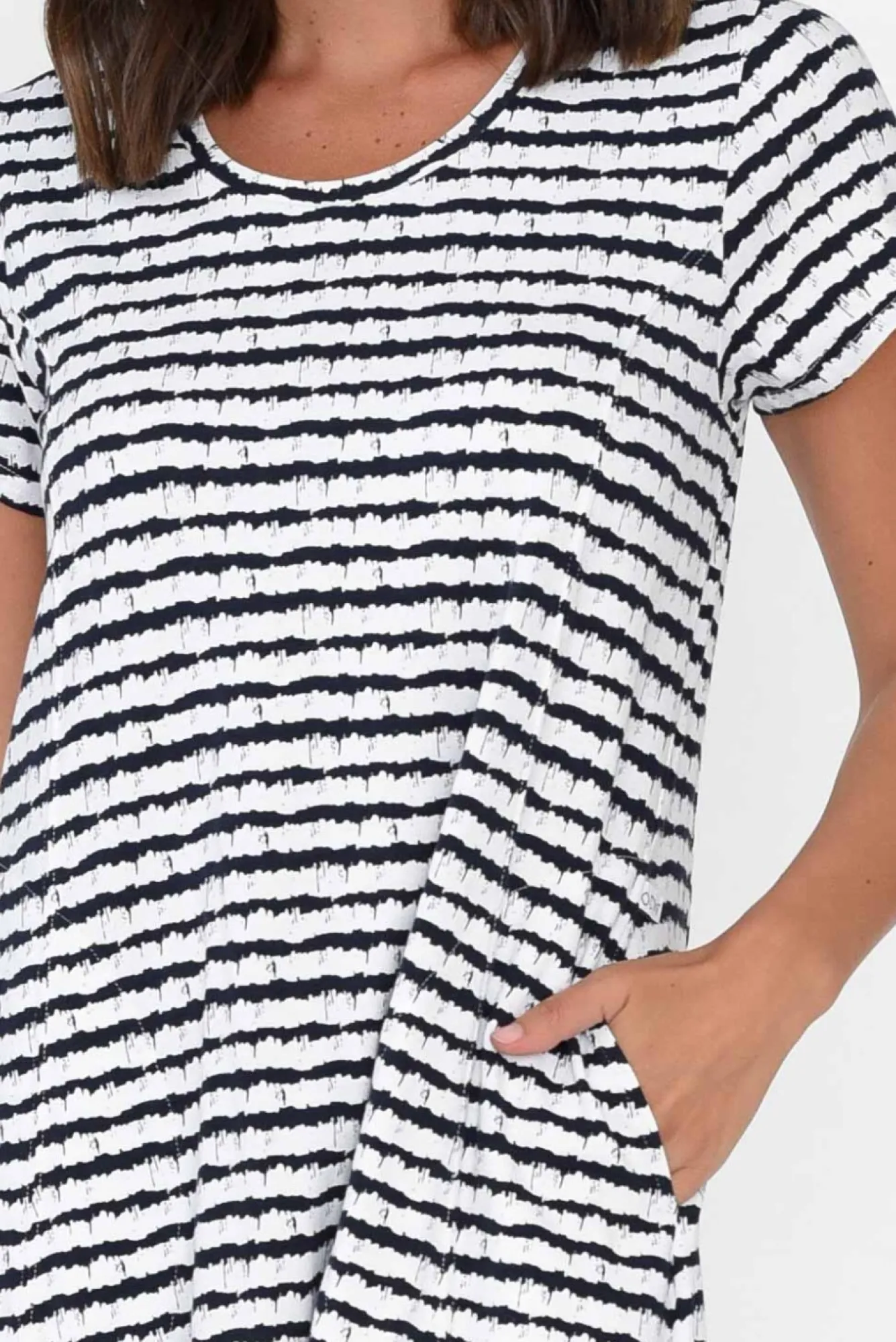 Fit: True To Size. Refer To Size & Fit Tab Below For Specific Size RecommendationNNfabric: Cotton/ElastaneNmade From Ultra-Comfortable And Stretchy Cotton Blend Fabric Offering Breathability And Soft Hand Feel NNclassic Round Neckline With Short Tee-Style Sleeves NNbreezy A-Line Silhouette Elevated By A Curved Gather Detail At The Back And Feature Stitching From Bust To BaseNNtwo Side Seam Pockets Defined By Exposed Stitching Detail NNfeature Hi-Lo Hemline Falls To Midi Length NNNcare: Cool Gentle Machine Wash RecommendedNNcolour: White Base With Navy Tie-Dye Style Stripes