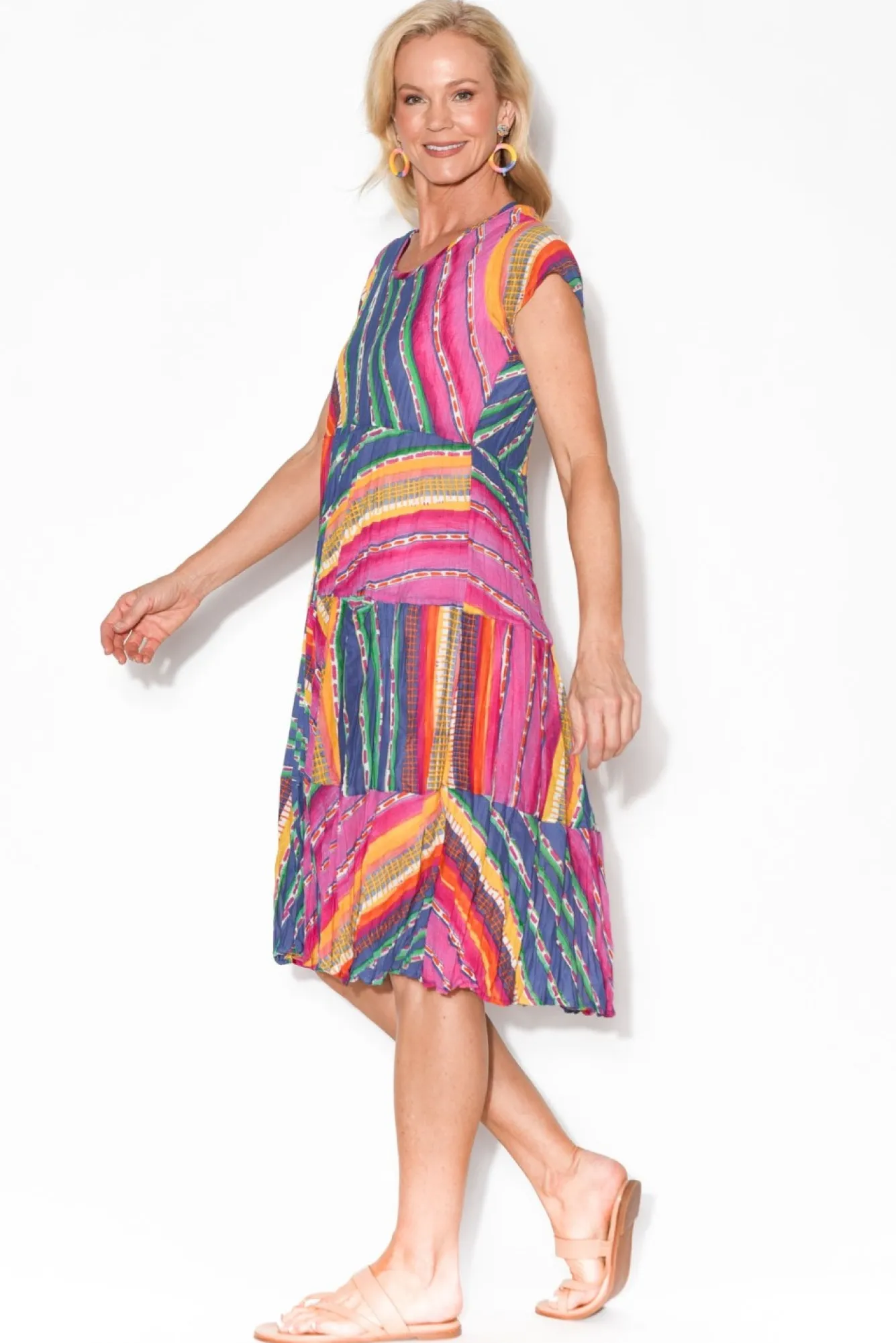 Fit: True To Size. Refer To Size & Fit Tab Below For Specific Size Recommendation NNfabric: 100% Organic CottonNa Comfortable And Breathable Cotton Garment With Textured Crinkle Finish Ndesigned With A Full Length Fixed Lining For Added Coverage And ComfortNfeaturing A Classic Round Neckline And Short SleevesNflowy, A-Line Silhouette Accentuated By Tiered Design From Waist To BaseNNtwo Internal Slip Pockets Located At The Torso NNstraight Hemline Falls To The KneeNNNcare: Cool Gentle Hand Wash RecommendedNNcolour: Berry Pink Base With Hints Of Green, Blue And Yellow In Abstract Stripe