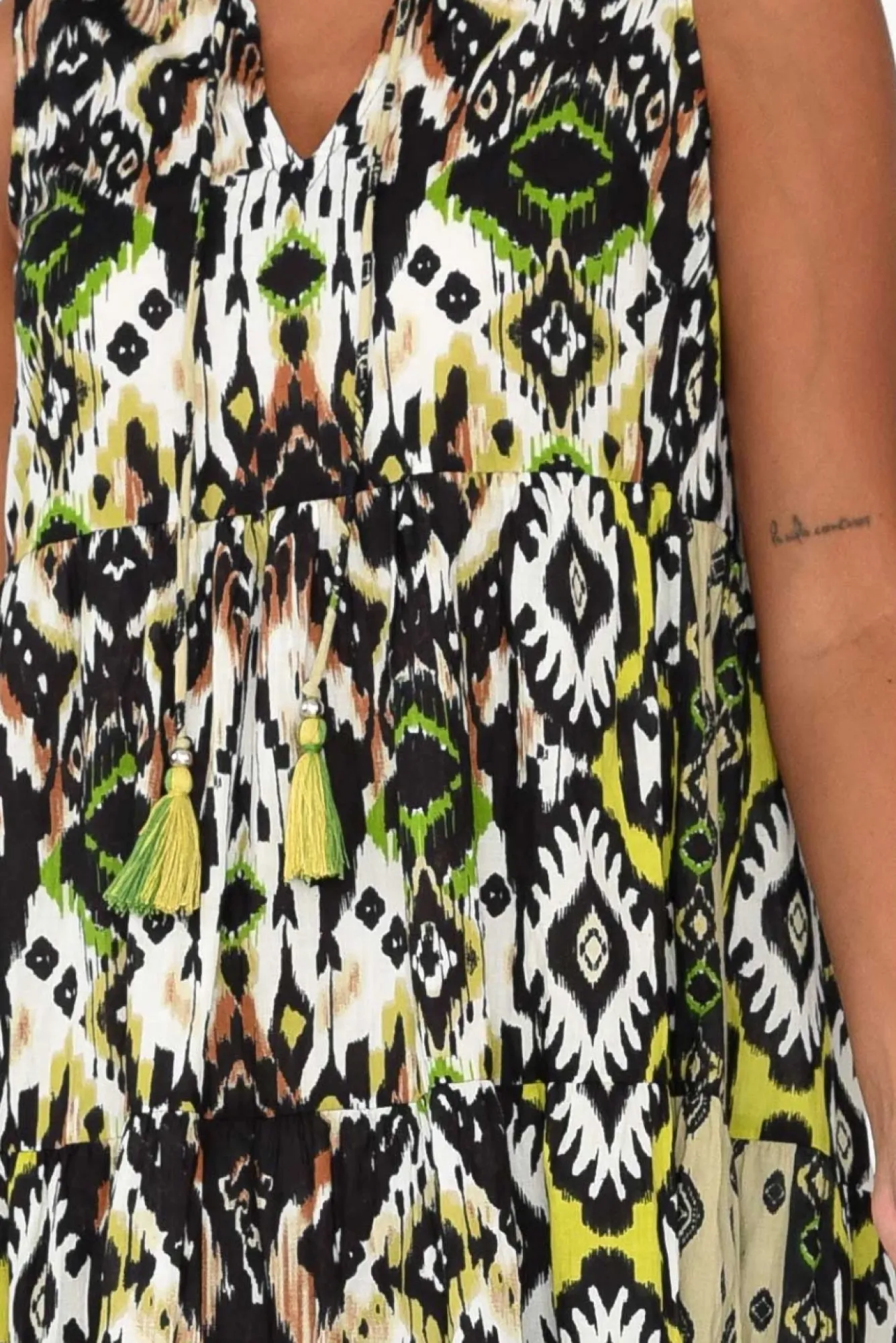 Fit: True To Size. Refer To Size & Fit Tab Below For Specific Size RecommendationNNfabric: 100% Cotton Ncrafted From Organic Cotton With Lightweight, Breathable Qualities And A Crinkle Finish Nround Banded Neckline With A V-Split And Tassel Tie Detail NNsummery Sleeveless Design NNa-Line Silhouette With Pleated Tiers Creates A Feminine LookNNtwo Practical Hip PocketsNNstraight Hem Falls To A Below Knee LengthNNNcare: Cool Gentle Hand Wash RecommendedNNcolour: Collage Of Black And White Geometric-Style Print With Hints Of GreenNNfabric Tip: Store It Rolled Up Either In The Wardrobe Or In Your Suitcase To Keep The Crinkle Alive!