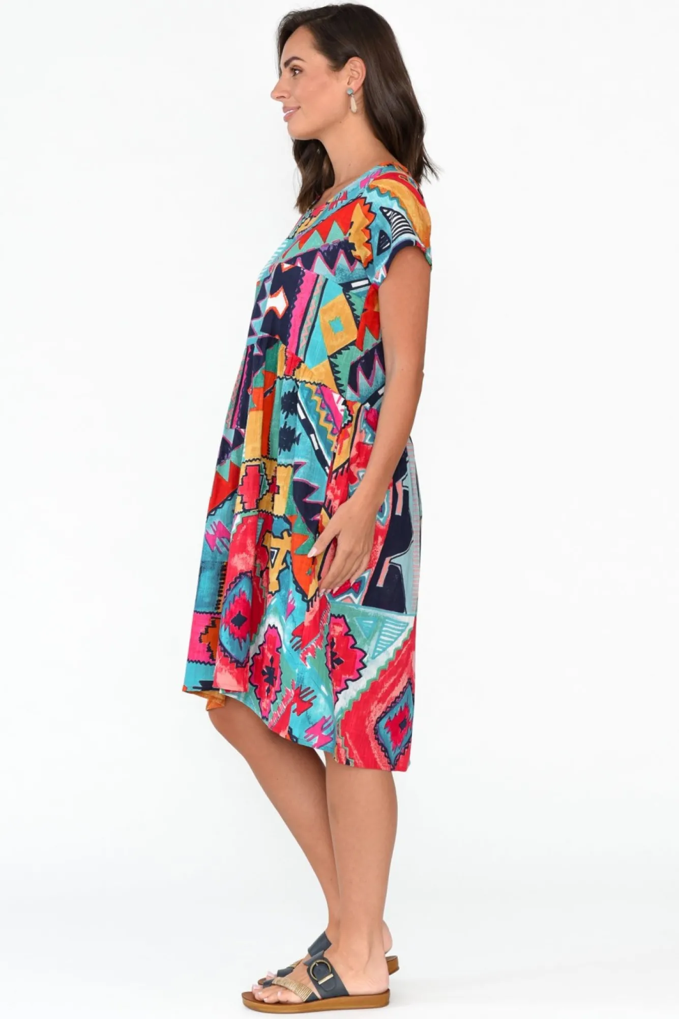Fit: True To Size. Refer To Size & Fit Tab Below For Specific Size RecommendationNNfabric: 100% Organic CottonNultra-Breathable, Non-Stretch Organic Cotton With A Lovely Woven Hand Feel NNsimple Round Neckline Skims Below The Collarbones NNkeyhole Detail At The Back With Button ClosureNclassic Straight Short Sleeves Nrelaxed Smock-Style Silhouette With A Loose-Gathered Waist To Create An A-Line SkirtNNdiscreet Pockets Located In Side Seams NNstraight Hem Falls To The Knee NNNcare: Cool Gentle Machine Wash RecommendedNNcolour: Eye-Catching Blue And Red Detailed Abstract Illustrations