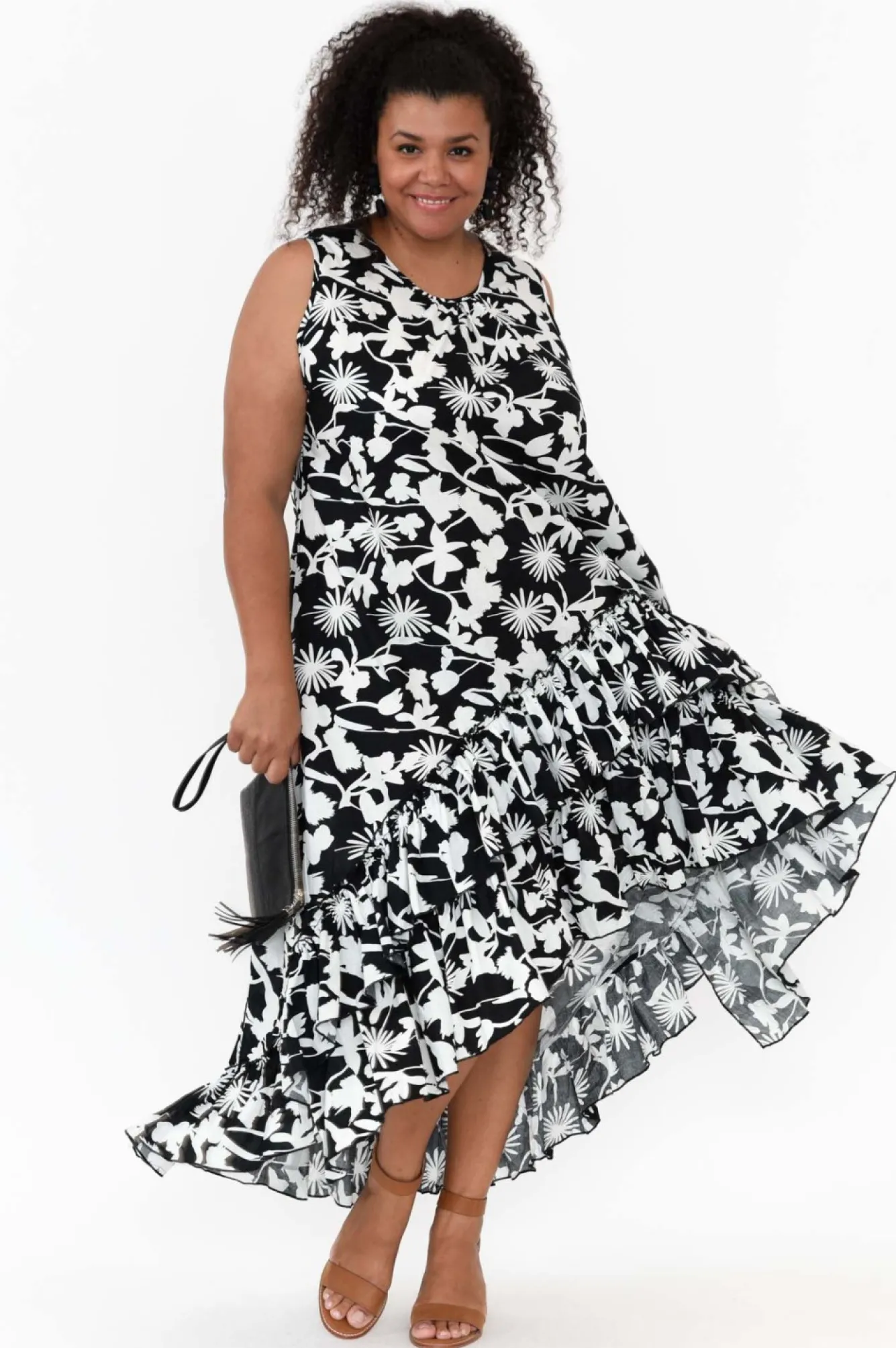 Fit: True To Size. Refer To Size & Fit Tab Below For Specific Size RecommendationNNfabric: 100% CottonNgive Your Summer Event Wardrobe A Re-Fresh With This Eye-Catching Ruffle Dress That Is Sure To Make A Statement On Any Occasion!Ncrafted From Lightweight, Breathable And Non-Stretch Cotton With A Lovely Smooth Poplin Feel NNclassic Round Neckline With Feature Gathers NNsleeveless Design NNfeaturing A Zip Closure At The BackNflattering A-Line Silhouette With Statement Ruffle Tiered SkirtNtwo Discreet Hip Pockets NNdramatic Asymmetric Hi-Lo Hemline Featuring Fabulous Ruffle Detailing NNNcare: Cool Gentle Hand Wash RecommendedNNcolour: Striking Black And White Modern Floral PrintNN Note:Please See Photos Rather Than Video For Most Accurate Colour.