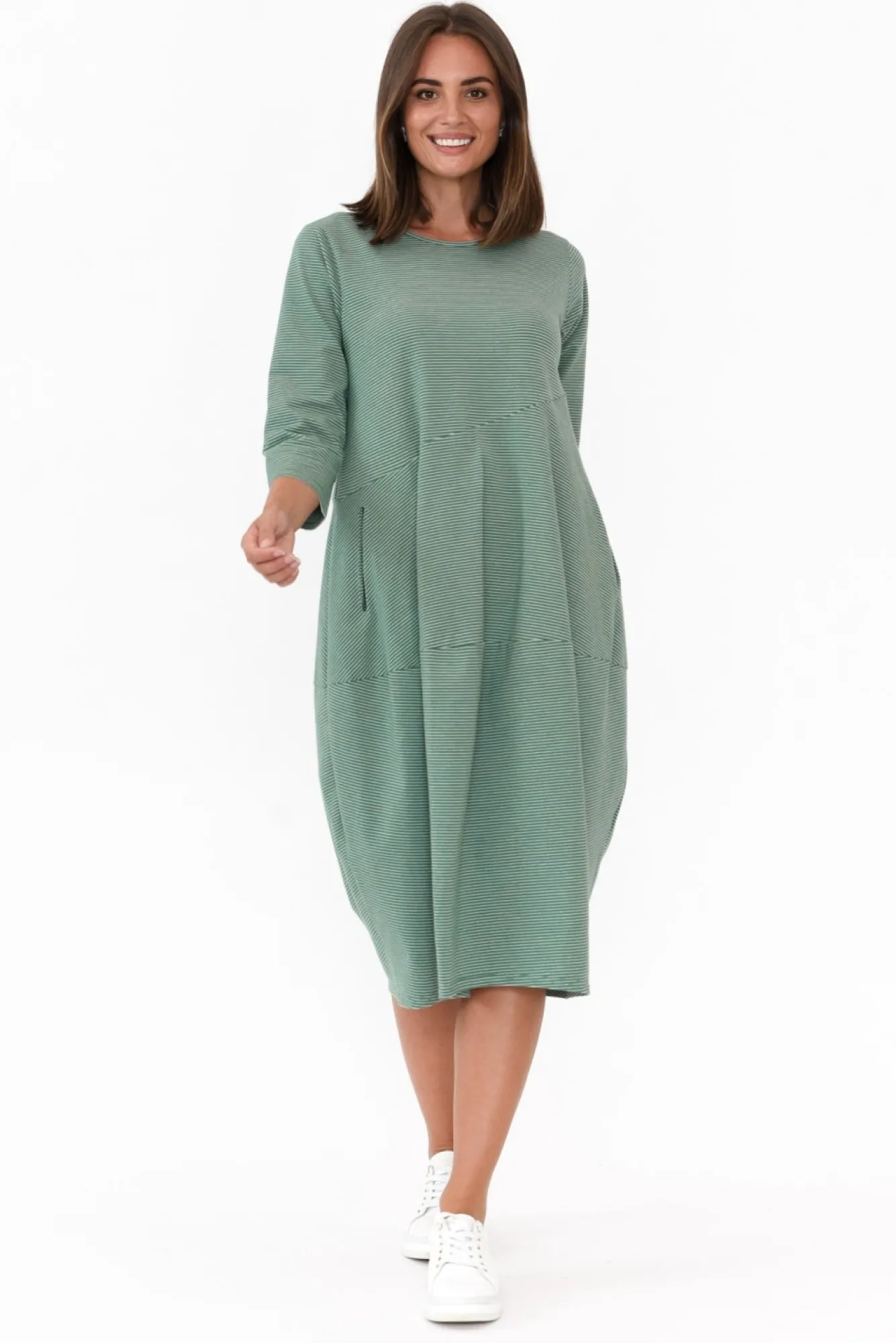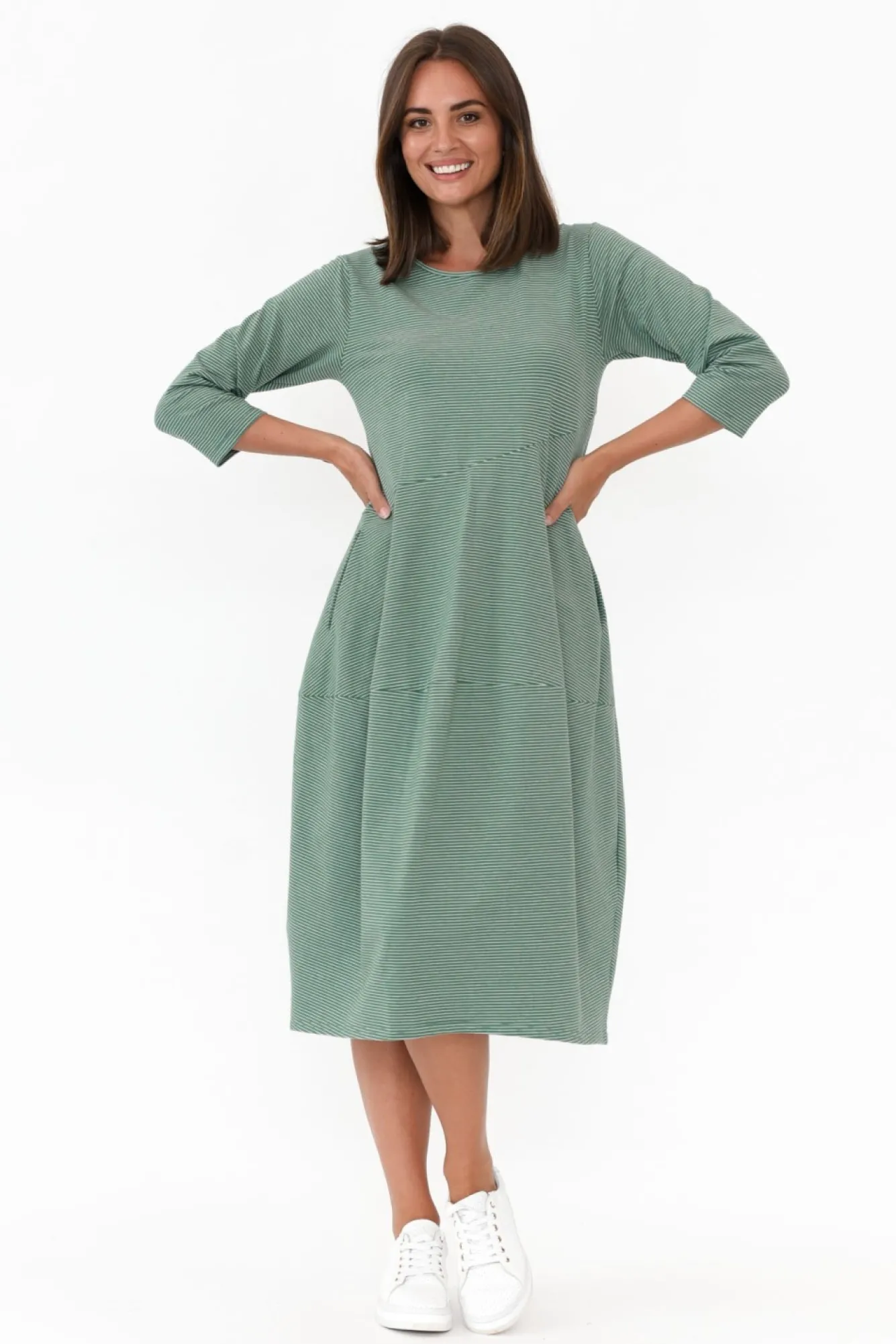 Fit: True. Refer To Size & Fit Tab Below For Specific Size RecommendationNNfabric: 95% Cotton, 5% ElastaneNcomfortable Midweight And Breathable Cotton Blend Fabric With Slight Stretch NNclassic Rounded Neckline And 3/4 Length SleevesNhorizontal Stripes Contrast With The Diagonal Seams Down The DressNtwo Internal Front PocketsNelevated Structured Look With A Lovely Comfy FeelNballoon Silhouette Flatters CurvesNtapered Hem Hits A Below-Knee Length NNcare: Cool Gentle Hand Wash RecommendedNNNcolour: Stunning Green Striped Shade