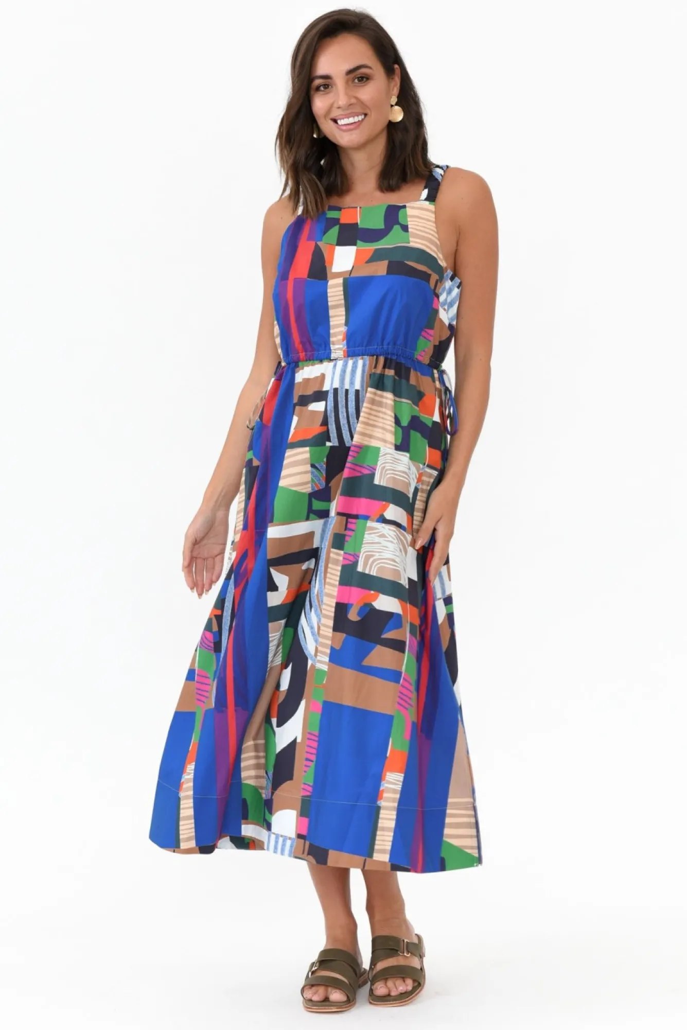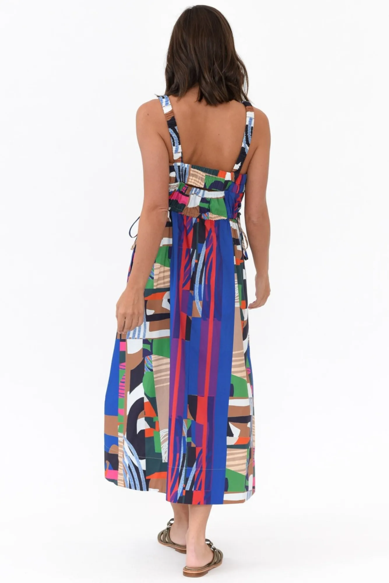 Fit: True To Size. Refer To Size & Fit Tab Below For Specific Size RecommendationNNfabric: 100% CottonNbreathable, Lightweight And Non-Stretch Cotton With A Crisp Poplin Feel And A Structured DrapeNNhigh, Square Neckline With Stretchy, Ruched StrapsNNsleeveless Design, Perfect For Warmer WeatherNNwide Elastic Strap Across The Back Featuring A Small Cutout Below Na-Line Silhouette With A Full, Flowing Skirt Featuring Side Splits At The HemNNdrawstring Waist Creates The Perfect Fit Nbodice Is Lined And Skirt Is Unlined NNtwo Discreet Hip PocketsNNmidi Length NNNcare: Cool Gentle Machine Wash RecommendedNNcolour: Stunning Abstract Print Featuring Blue, Green, Pink And Tan Hues