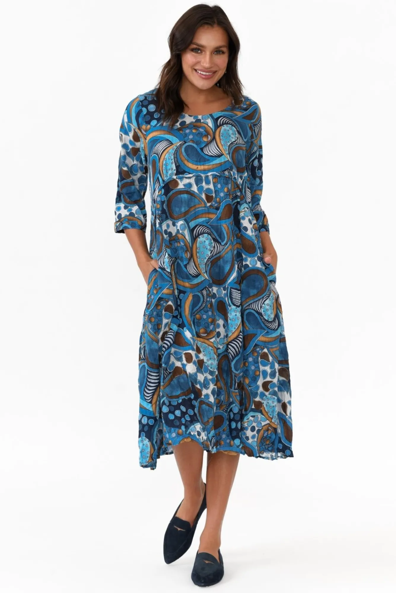 Fit: True To Size. Refer To Size & Fit Tab Below For Specific Size RecommendationNNfabric: Cotton/PolyesterNbreezy, Lightweight And Non-Stretch Cotton Blend Fabric With A No-Iron Crinkle Finish Nfabric Is Semi Seer, We Recommend Pairing With Nude Undergarments Nround Neckline Skims Just Below The Collarbones NN 3/4 Length Sleeves For A Transeasonal Look Ndesigned With A Crescent Waist To Enhance The A-Line Silhouette, Browse Of Crescent Waist Collection HereNNtwo Handy Side Seam Pockets NNhem Falls To Easy-To-Wear Midi Length NNNcare: Cool Gentle Hand Wash RecommendedNNcolour: A Bold Collection Of Abstract Prints In Hues Of Blue