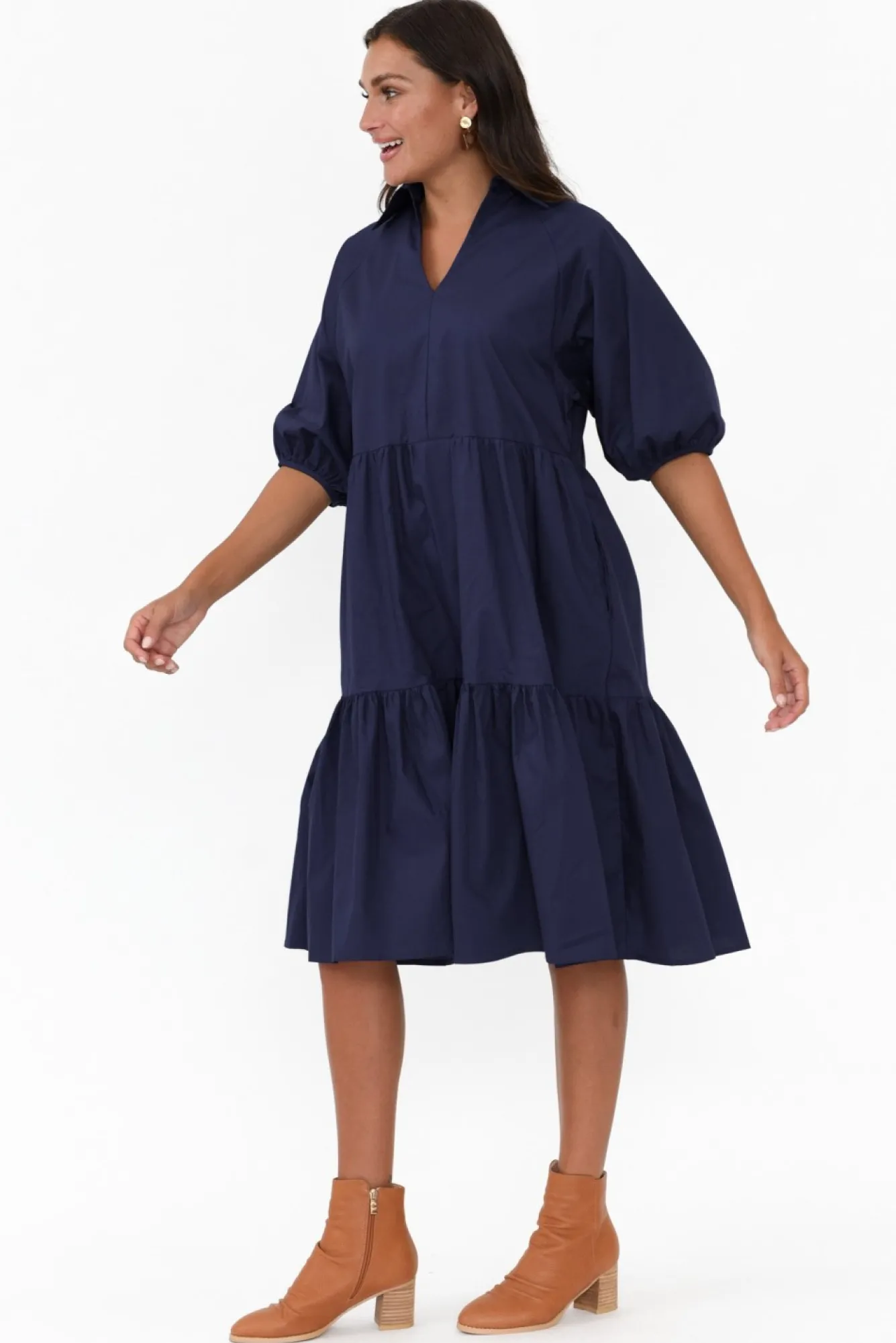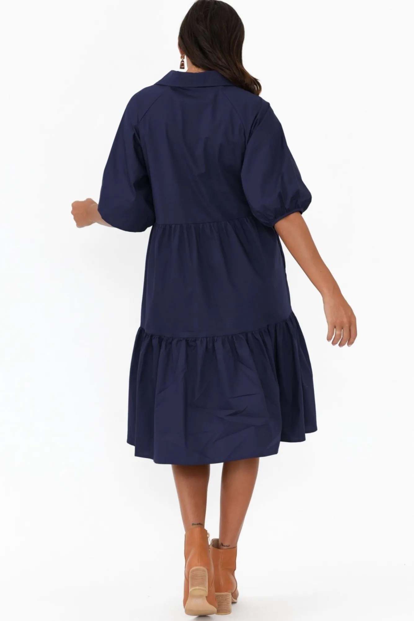 Fit: True To Size. Refer To Size & Fit Tab Below For Specific Size RecommendationNNfabric: 100% CottonNlovely Lightweight, Breathable And Non-Stretch Cotton With A Crisp Poplin Hand Feel NNelegant Collared Neckline With V-Split Detail NNhalf-Length Puff Sleeves NNtiered A-Line Silhouette For A Timeless Look NNtwo Discreet Hip Pockets NNhemline Falls Just Below Knee Length NNcare: Cool Gentle Hand Wash RecommendedNNcolour: Deep Sapphire Navy
