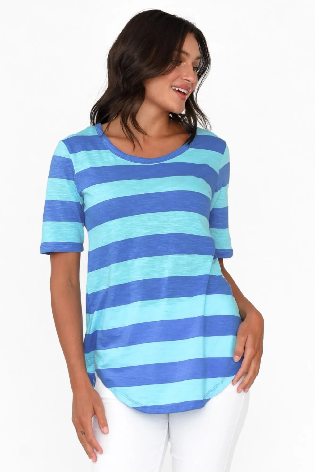 Fit: True. Refer To Size & Fit Tab Below For Specific Size RecommendationNNfabric: 100% CottonNlightweight, Breathable And Slightly Stretchy Cotton With A Soft Slub Texture NNslightly Sheer Fabric, We Recommend Wearing Nude UndergarmentsNclassic Round Neckline With Short, Straight SleevesNdesigned In A Must-Have Tee SilhouetteNdramatic Curved Hemline Falls To The HipNNcare: Cool Gentle Hand Wash RecommendedNNcolour: Aqua And Oceanic Blue Stripe Print