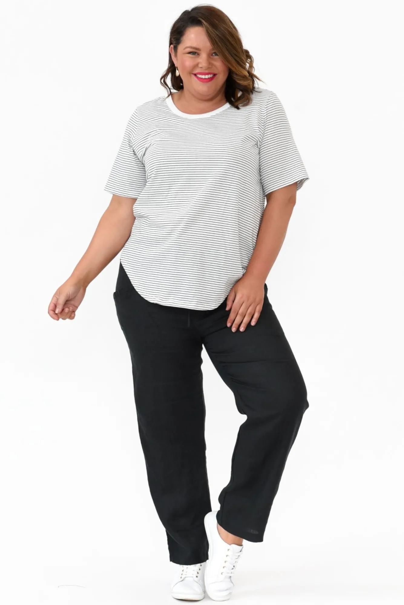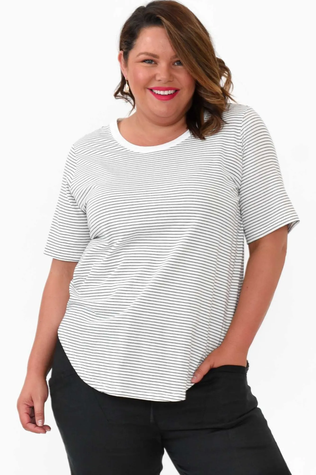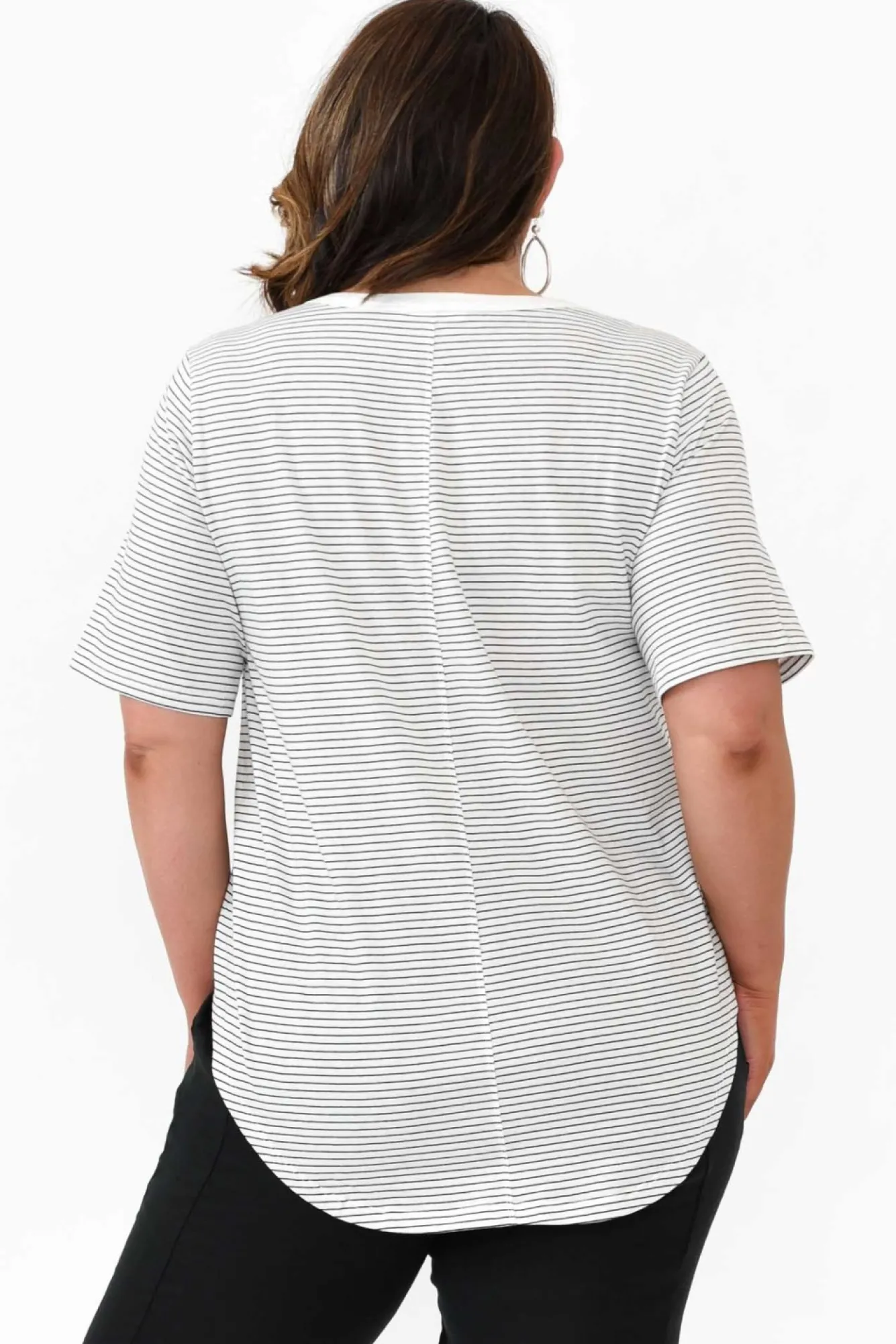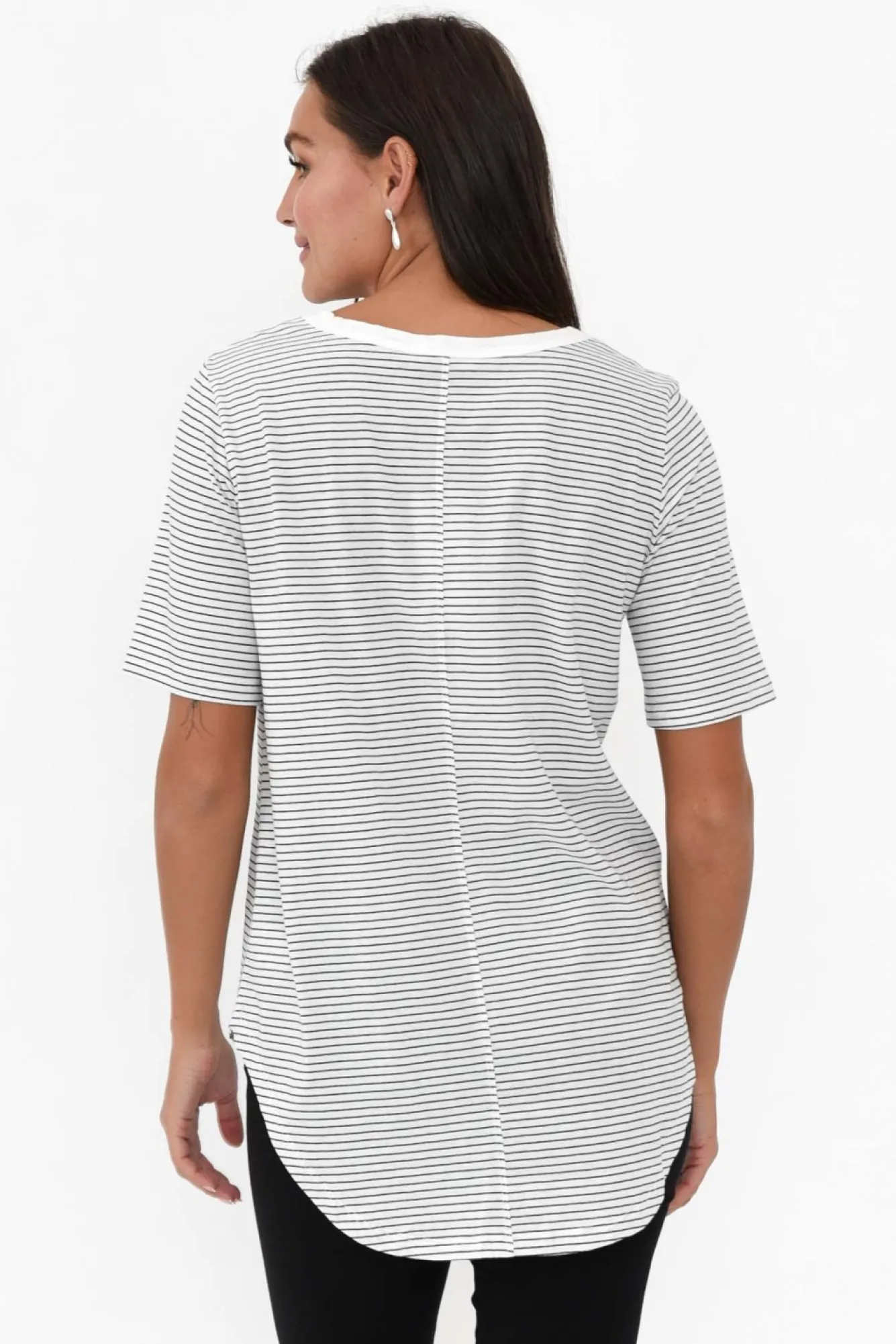 Fit: True To Size. Refer To Size & Fit Tab Below For Specific Size Recommendation NNfabric: 100% CottonNlightweight, Soft And Stretchy Cotton Fabric – Perfect For LayeringNsimple Round NecklineNNshort SleevesNversatile Straight Silhouette Ncurved Hi-Lo Hemline Falls Below Hip Length NNcare: Cool Gentle Hand Wash RecommendedNNcolour: White Base With Black Stripes