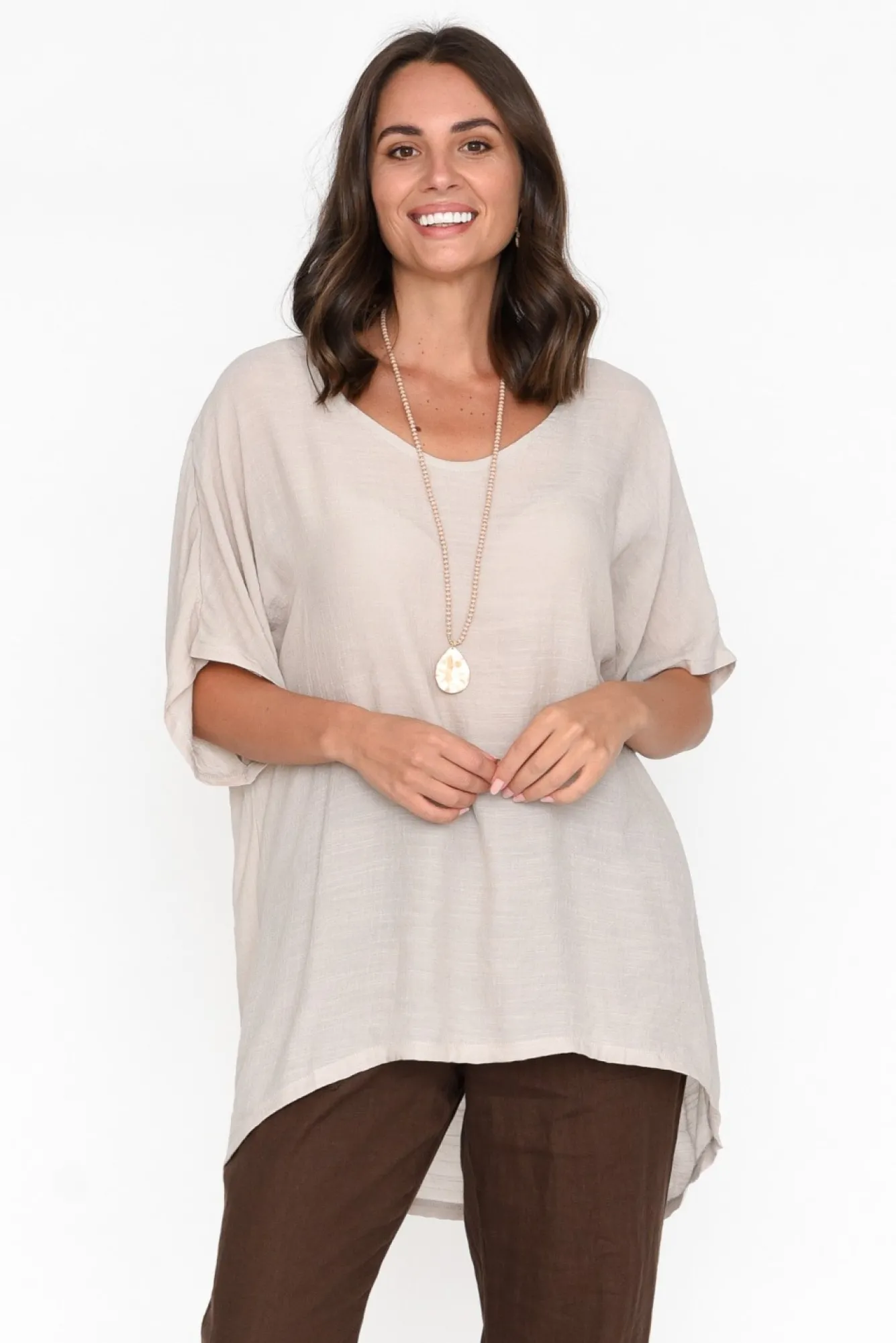 Fit: True To Size. Refer To Size & Fit Tab Below For Specific Size RecommendationNNfabric: 68% Cotton, 32% RayonNcrafted From Ultra-Lightweight, Breathable And Non-Stretch Cotton Blend Fabric Designed With A Subtle Textured Finish NNfabric Is Semi-Sheer, We Recommend Pairing With Nude Undergarments Nsoft V-Neckline Frames The Collarbones NNclassic Half-Length SleevesNNbreezy Drape Silhouette NNfeature Hi-Lo Hemline Falls Below Hip LengthNNcare: Cool Gentle Machine Wash RecommendedNNcolour: Soft Natural Stone Hue