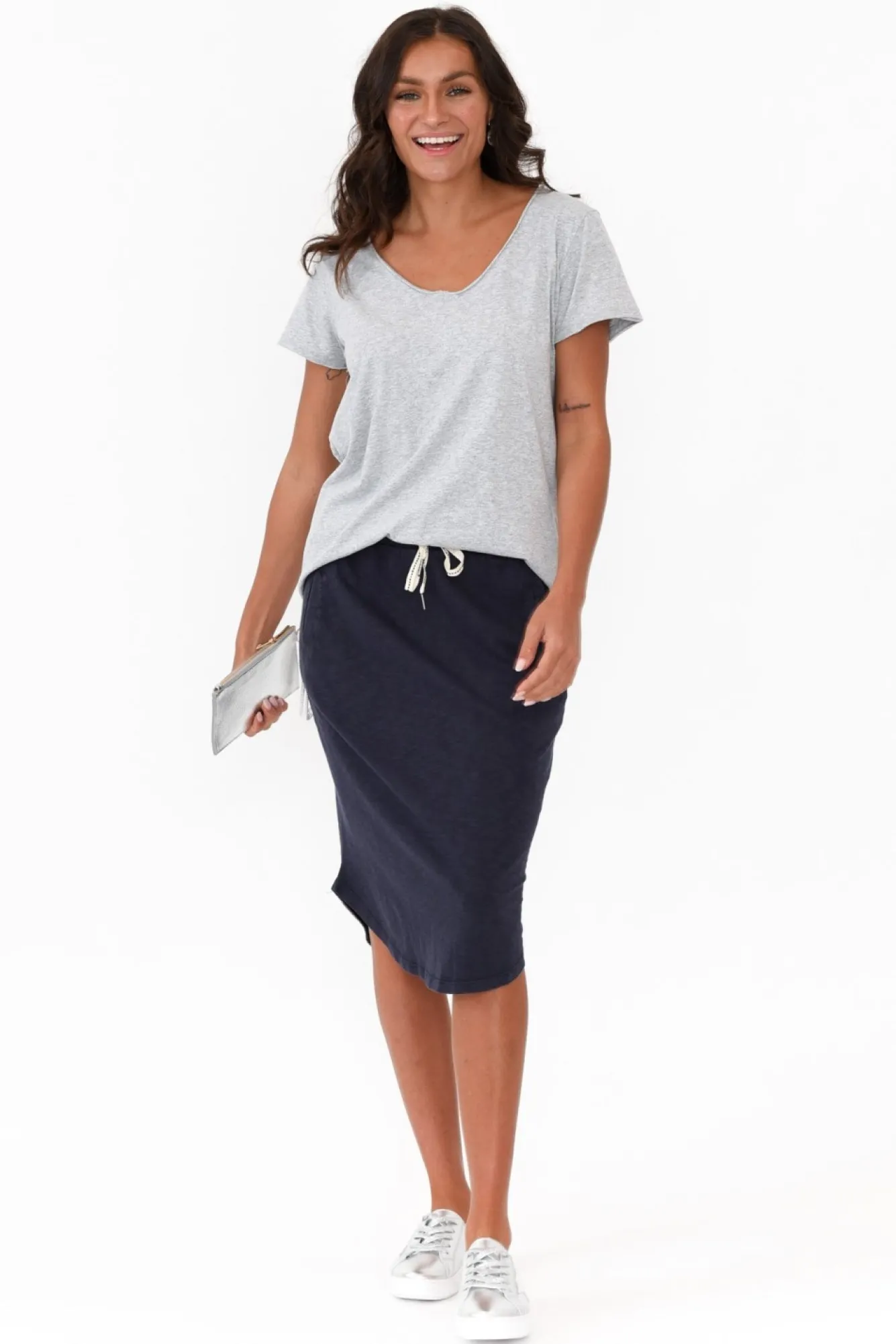 Fit: True. Refer To Size & Fit Tab Below For Specific Size RecommendationNNfabric: 100% CottonNsoft, Lightweight, Breathable Cotton Slub Fabric With StretchNrounded V-Neckline And Short Cap Sleeves Create A Class Tee LookNraw Hemline EdgesNwhite Patch With Elm Branding On Bottom Left HipNsmall White Elm Branding Tab On Bottom Right-Hand Side HemlineNstitching Seam Detail Runs Down The Middle Of The BackNhip Skimming LengthNNcare: Cool Gentle Machine Wash RecommendedNNcolour: Grey Shade