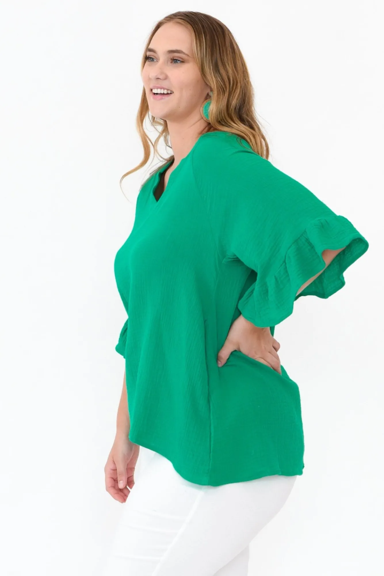 Fit: True To Size. Refer To Size & Fit Tab Below For Specific Size Recommendation NNfabric: 100% CottonNgorgeous Lightweight, Breathable And Non-Stretch Fabric With A Lovely Crinkle Texture NNclassic V-Neckline Nhalf Length Sleeves With Statement Frill CuffNNrelaxed A-Line Silhouette NNtwo Discreet Pockets Located Near WaistNNstraight Hemline Drapes To Hip Skimming Length NNNcare: Cool Gentle Hand Wash RecommendedNNcolour: Vibrant Green Shade