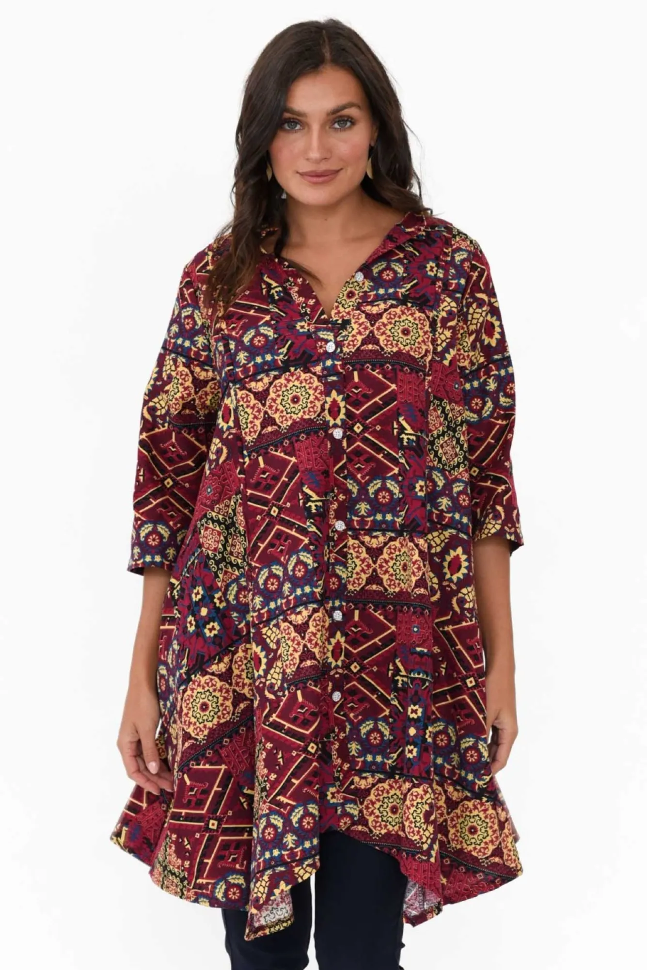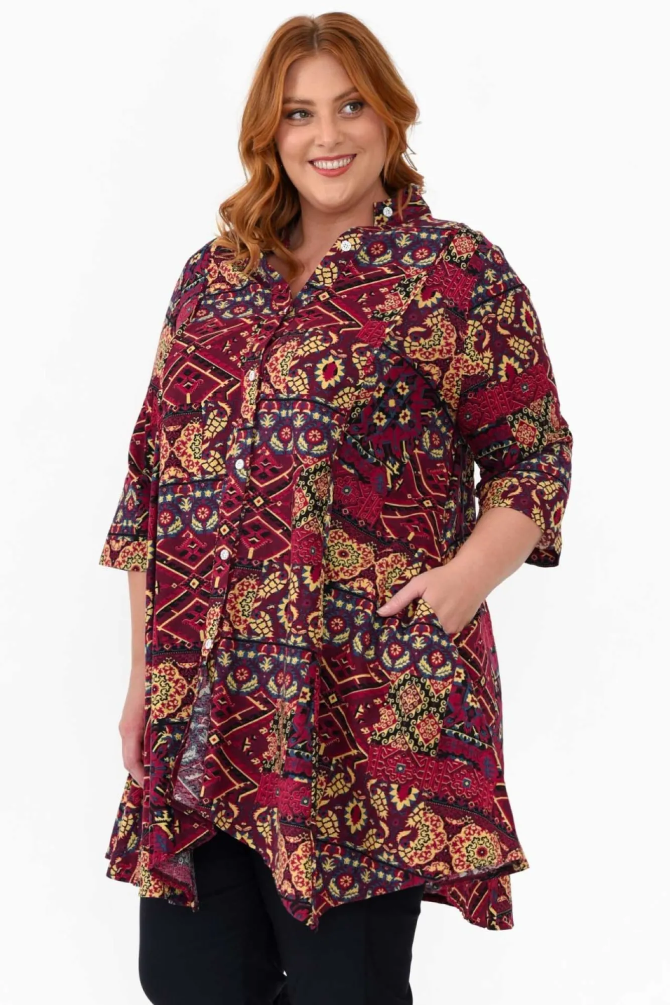 Fit: True To Size. Oversized Fit. Refer To Size & Fit Tab Below For Specific Size Recommendation NNfabric: 70% Cotton, 30% LinenNmade From A Lightweight And Breathable Blend Of Natural Fibres Nsharp Collared Neckline Complete With A Button-Down Front Nclassic 3/4 Length Sleeves NNa-Line Tunic Design Enhanced By Flaring At The Hips NNtwo Side Seam Pockets NNasymmetrical Hemline Falls To An Above-Knee LengthNNcare: Cool Gentle Hand Wash RecommendedNNcolour: Berry Pink Base With An Intricate Diamond Print NNstyle Tip: Pair With Your Favourite Pair Of Pants, Jeans Or Leggings For More Coverage Or To Complete The Look.