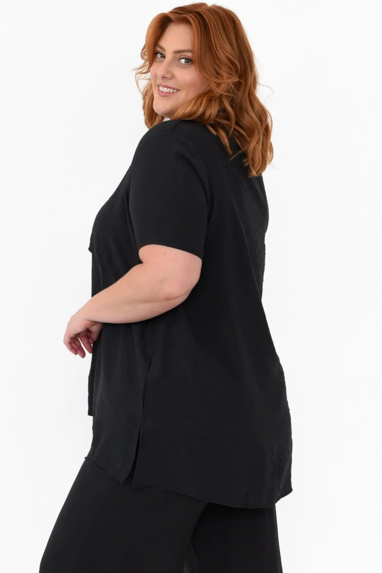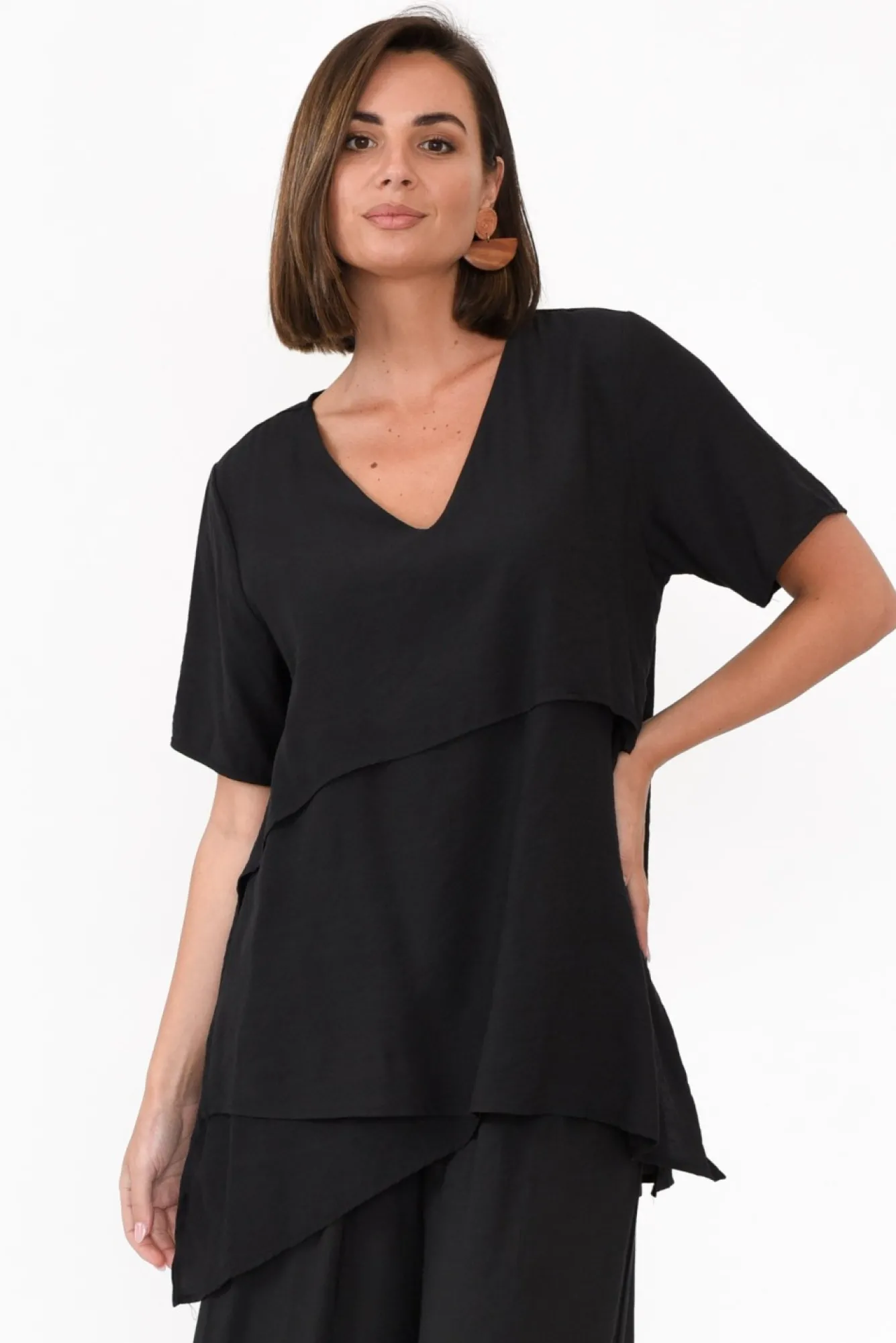 Fit: True To Size. Refer To Size & Fit Tab Below For Specific Size RecommendationNNfabric: Cotton BlendNa Breathable Cotton Garment With A Flattering Twist To The Basic Black TopNNdesigned With A Sharp, V-Neckline NNshort, Straight-Style SleevesNa Gorgeous A-Line Shape Enhanced By Feature Layered Fabric On Front NNhi-Lo Split Hemline CombinationNgarment Drapes Over The HipsNNcare: Cool Gentle Hand Wash RecommendedNNcolour: Staple Black Shade