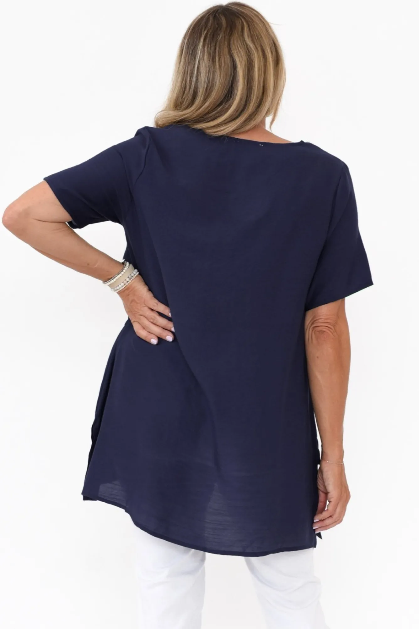 Fit: True To Size. Refer To Size & Fit Tab Below For Specific Size RecommendationNNfabric: Cotton BlendNa Breathable Cotton Garment With Details That Elevate Fromthe Basic T-ShirtNNdesigned With A Sharp, V-Neckline NNshort, Straight-Style SleevesNa Flattering A-Line Shape Enhanced By Statement Layered Fabric On Front NNhi-Lo Split Hemline CombinationNgarment Drapes Over The HipsNNcare: Cool Gentle Hand Wash RecommendedNNcolour: Versatile NavyNnote:Please See Photos Rather Than Video For Most Accurate Colour.