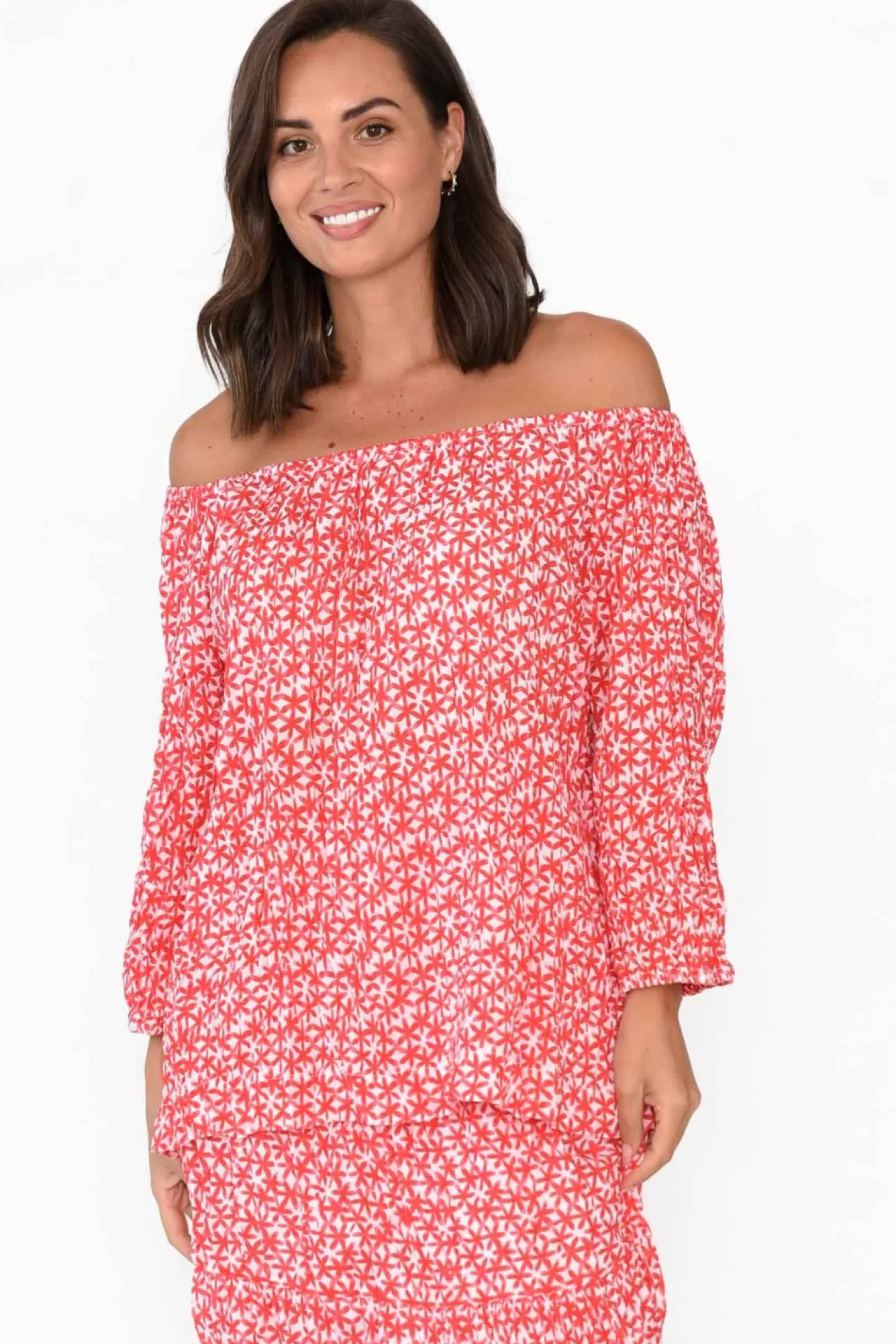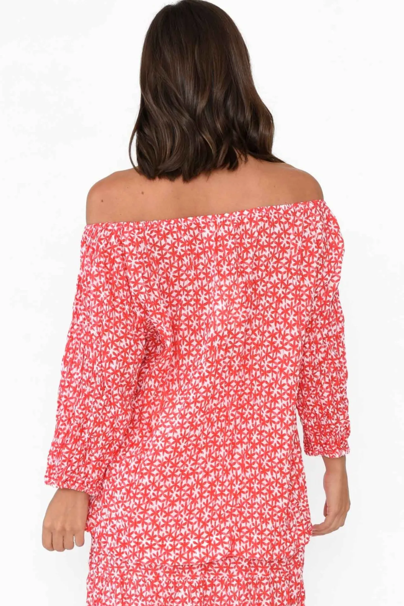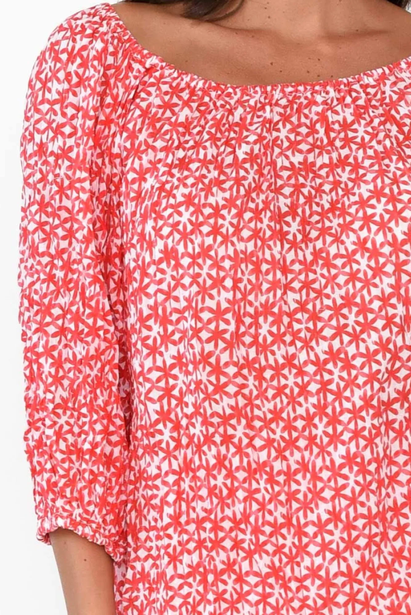 Fit: True To Size. Refer To Size & Fit Tab Below For Specific Size RecommendationNNfabric: 100% Cotton Nultra Lightweight And Naturally Breathable Cotton With A Fuss-Free Crinkle Finish And A Non-Stretch, Textured Hand FeelNNelasticised Neckline Can Be Worn On The Shoulders For A Boatneck Look Or Off The ShoulderNNsimple, Half-Length Sleeves With An Elasticised CuffNNstraight, Relaxed Silhouette For All-Day ComfortNNslight Hi-Lo Hemline Falls To A Hip-Skimming LengthNNNcare: Cool Gentle Hand Wash RecommendedNNcolour: White Base With A Dainty Red Floral Pattern