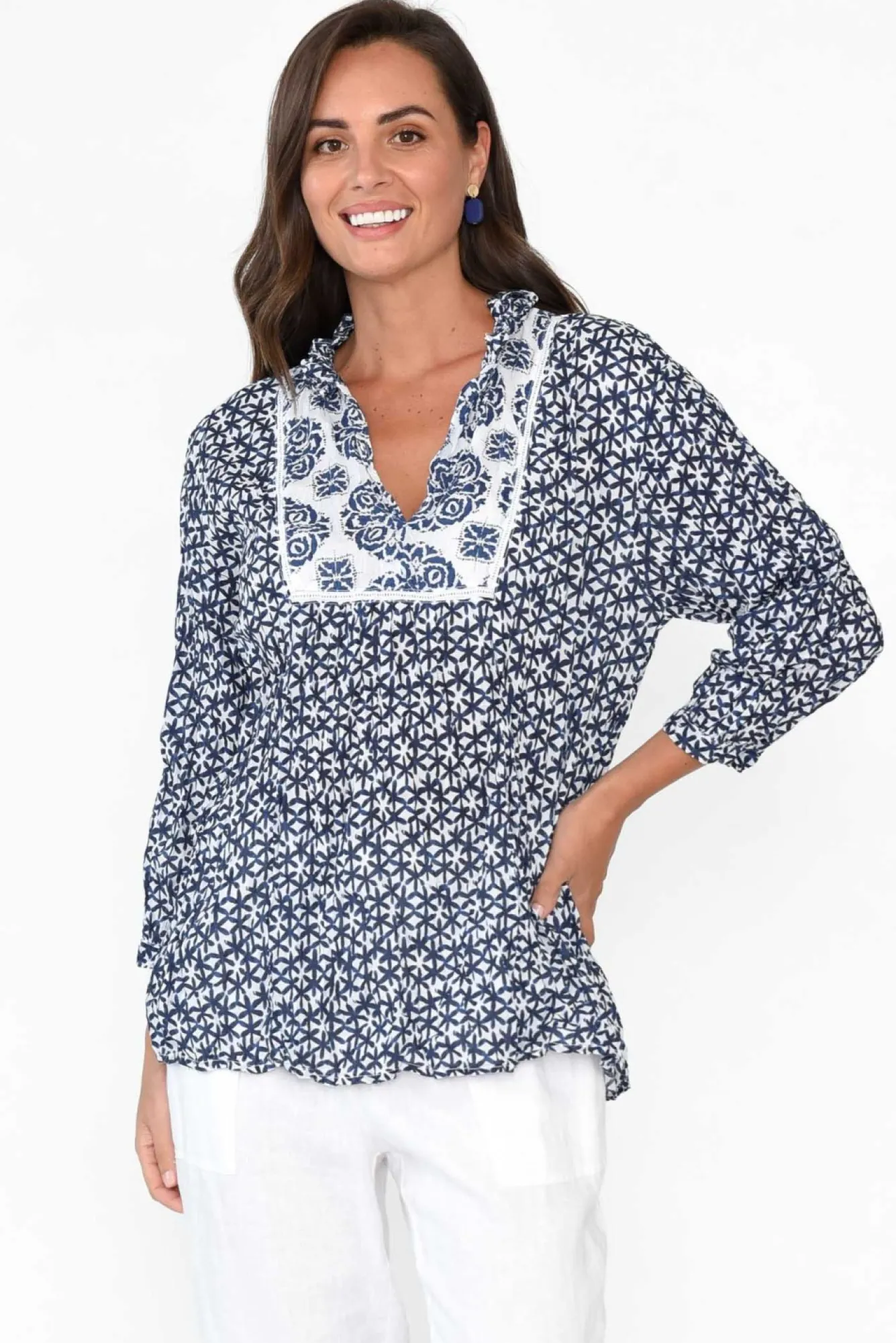 Fit: True To Size. Refer To Size & Fit Tab Below For Specific Size RecommendationNNfabric: 100% CottonNdesigned Using Ultra-Lightweight, Breathable Crinkle Cotton With A Non-Stretch, Woven Finish Nround Frill Neckline With A Sharp V-SplitNstraight, Three-Quarter Sleeves Ncontrast White And Blue Pattern And A Ladder Trim DetailNNversatile Straight Silhouette NNslight Hi-Lo Hem Skims The Hips NNNcare: Cool Gentle Hand Wash RecommendedNNcolour: White Base With A Dainty Navy Floral OverlayNNfabric Tip: Store It Rolled Up Either In The Wardrobe Or In Your Suitcase To Keep The Crinkle Alive!