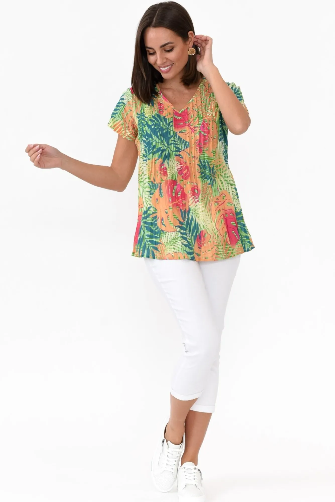 Fit: True To Size. Refer To Size & Fit Tab Below For Specific Size RecommendationNNfabric: 100% CottonNno Ironing Required For This Stunning Crinkle Cotton Top, Made From A Lightweight And Breathable FabricNclassic Tee Style Combining A V-Neckline And Short SleeveNNdelicate Pleating Details At The Bust Elevate This StyleNrelaxed A-Line FitNstraight Hemline Skims The HipsNNNcare: Cool Gentle Hand Wash RecommendedNNcolour: Light Green Base With A Multicolour Palm Overlay Featuring Pink And Orange HuesNNfabric Tip: Twist The Garment, Fold In Half And Secure With A Rubber Band To Store After Washing And Drying To Keep The Crinkle Alive