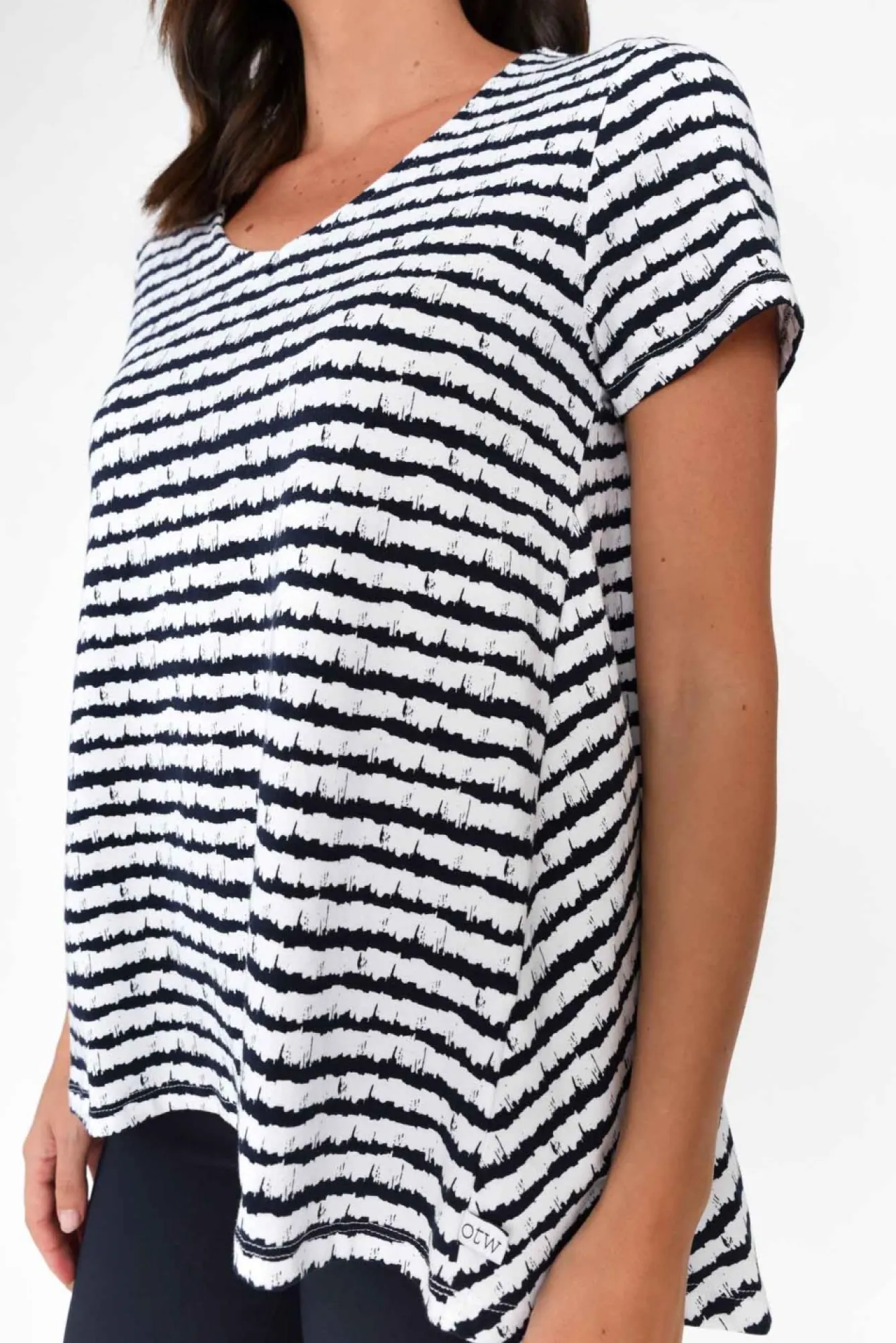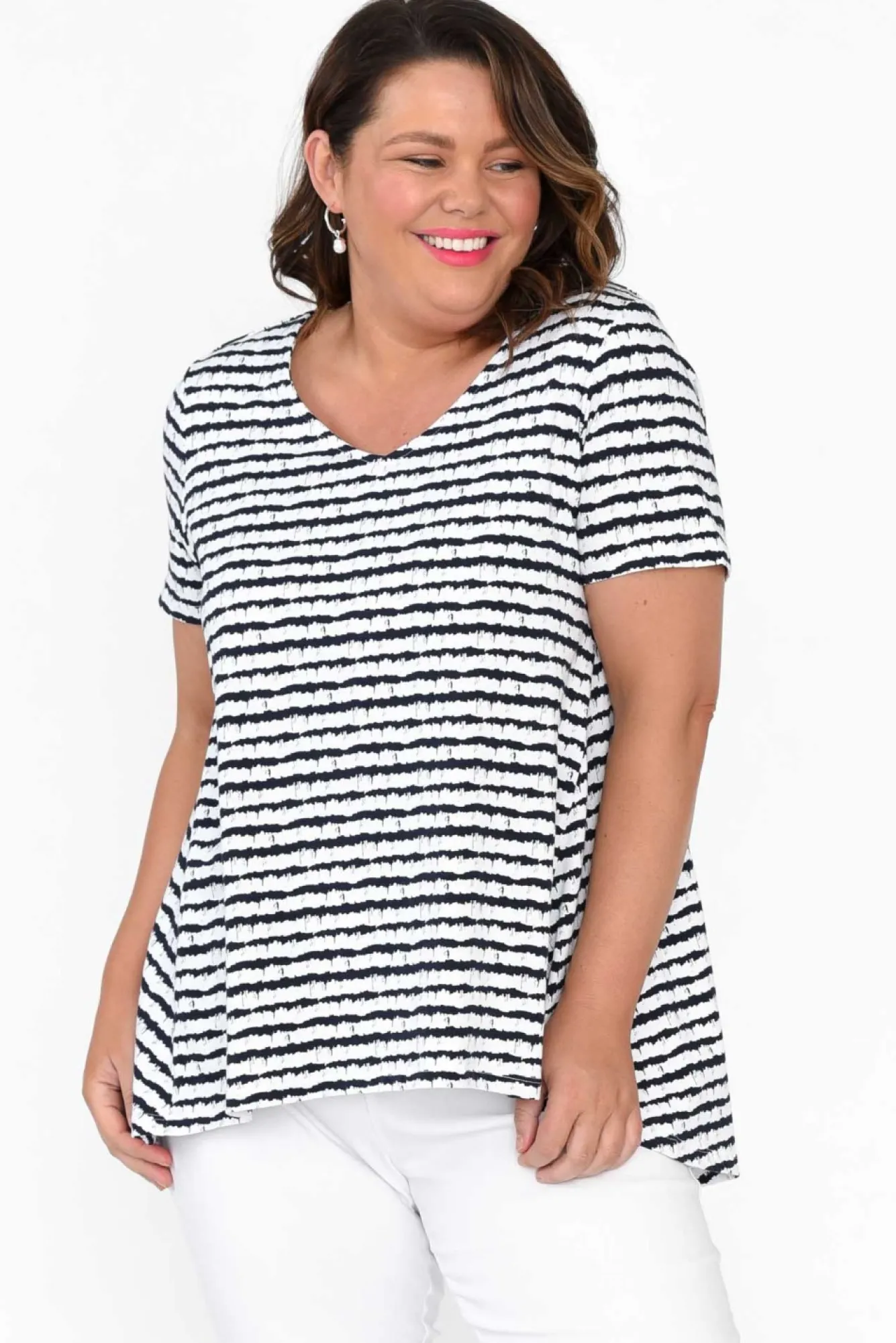 Fit: True To Size. Refer To Size & Fit Tab Below For Specific Size RecommendationNNfabric: Cotton / ElastaneNlightweight, Stretchy And Soft Cotton Blend Is Perfect For All-Day WearNNsoft V-Neckline Flatters Collarbones Nshort Tee-Style Sleeves NNa-Line Silhouette Flares At The Hem Creating A Relaxed Fit Over The Hips Ncurved Hi-Lo Hem Provides More Coverage At The Back NNNcare: Cool Gentle Machine Wash RecommendedNNcolour: White Base With Navy Tie-Dye Style Stripes