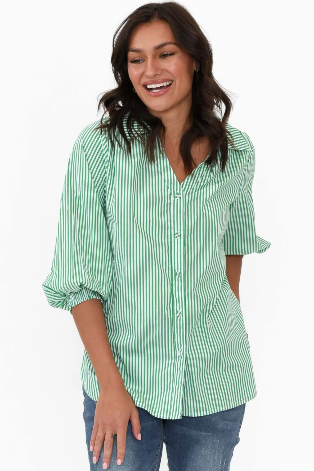 Cotton Tops<Silver Wishes Troy Green Stripe Cotton Shirt