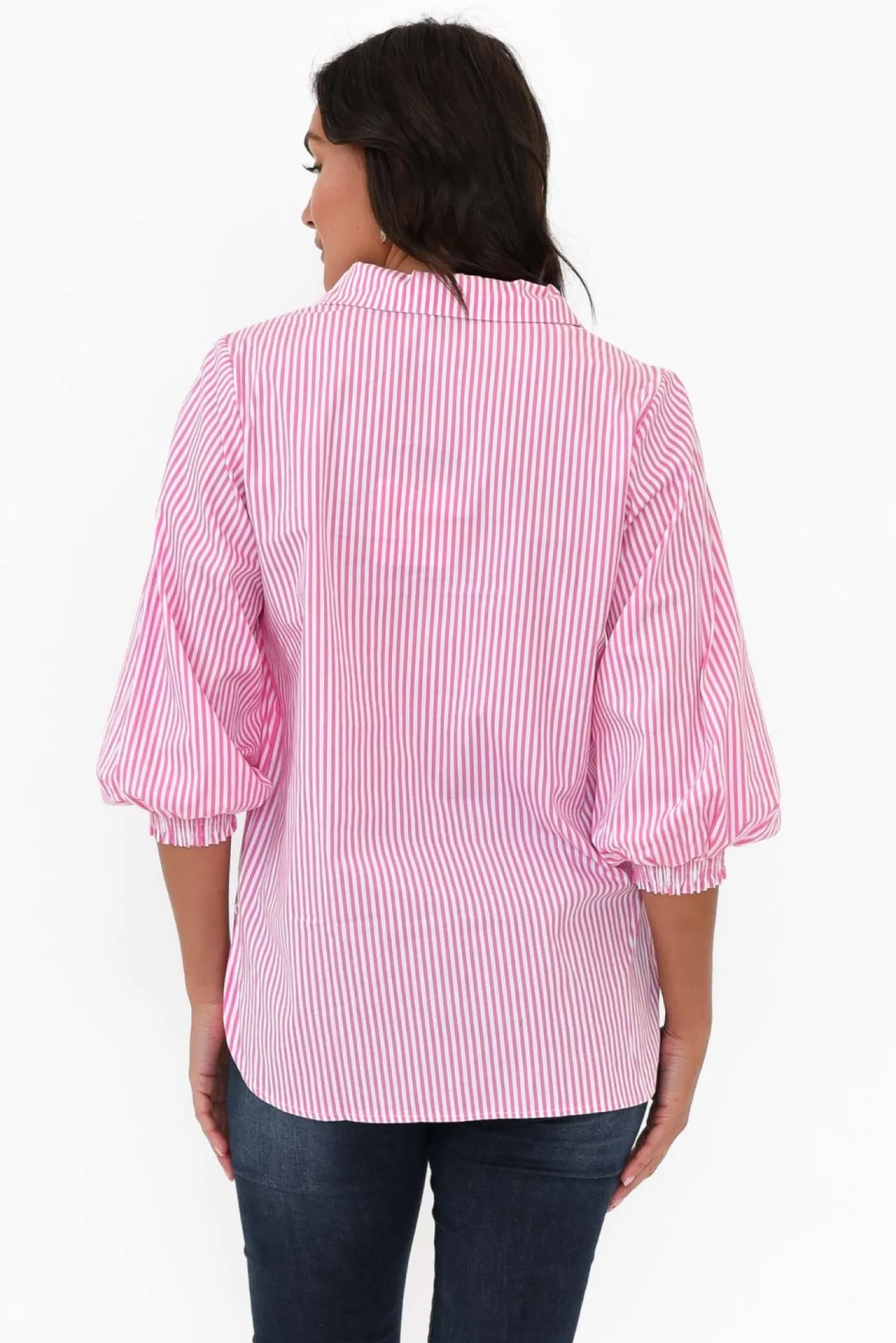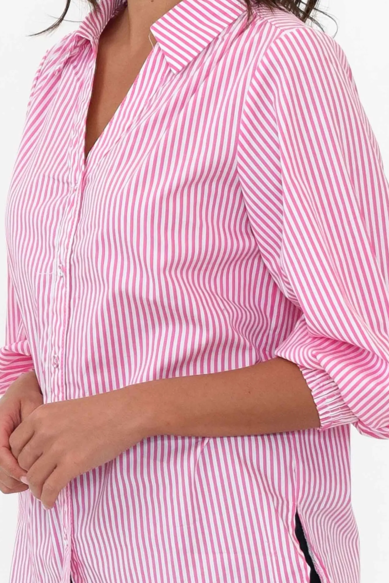 Fit: True To Size. Refer To Size & Fit Tab Below For Specific Size RecommendationNNfabric: 100% CottonNultra-Breathable Lightweight And Non-Stretch Cotton With An Elevated Crisp Hand FeelNNopen V-Neck Design Exaggerated By Sharp Collar NNtranseasonal Button-Down Front Featuring Fabric Buttons For A Refined Look N3/4 Length Puff Sleeves Enhanced By Elasticated Ruched Cuff NNversatile Straight Silhouette NNrounded Hemline Falls To Hip-Length NNNcare: Cool Gentle Hand Wash RecommendedNNcolour: Candy Pink And White Stripe
