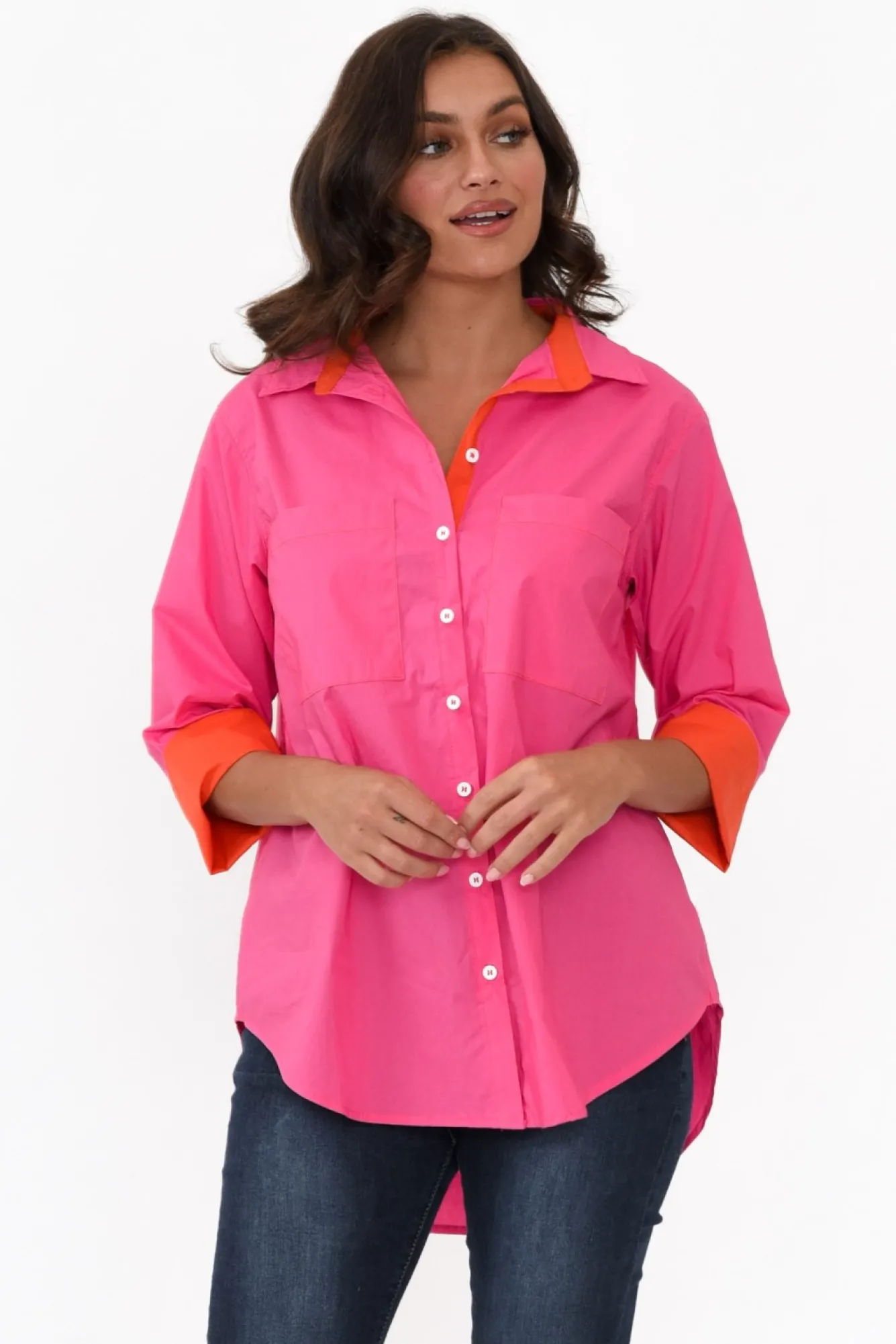 Fit: True To Size. Refer To Size & Fit Tab Below For Specific Size RecommendationNNfabric: 100% CottonNlightweight, Breathable And Non-Stretch Cotton Fabric With A Crisp Poplin Feel NNsharp Collared NecklineNclassic Button-Down Front With An Orange Contrast Detail On The Internal Placket Nrelaxed Straight Silhouette NNstraight 3/4 Length Sleeves Can Be Cuffed To Reveal An Orange Contrast Feature Ntwo Generous Front Pockets NNcurved Hi-Lo Hemline Falls Below Hip Length NNNcare: Cool Gentle Hand Wash RecommendedNNcolour: Hot Pink With Orange Contrasting NNnote: Please See Photos Rather Than Video For Most Accurate Colour