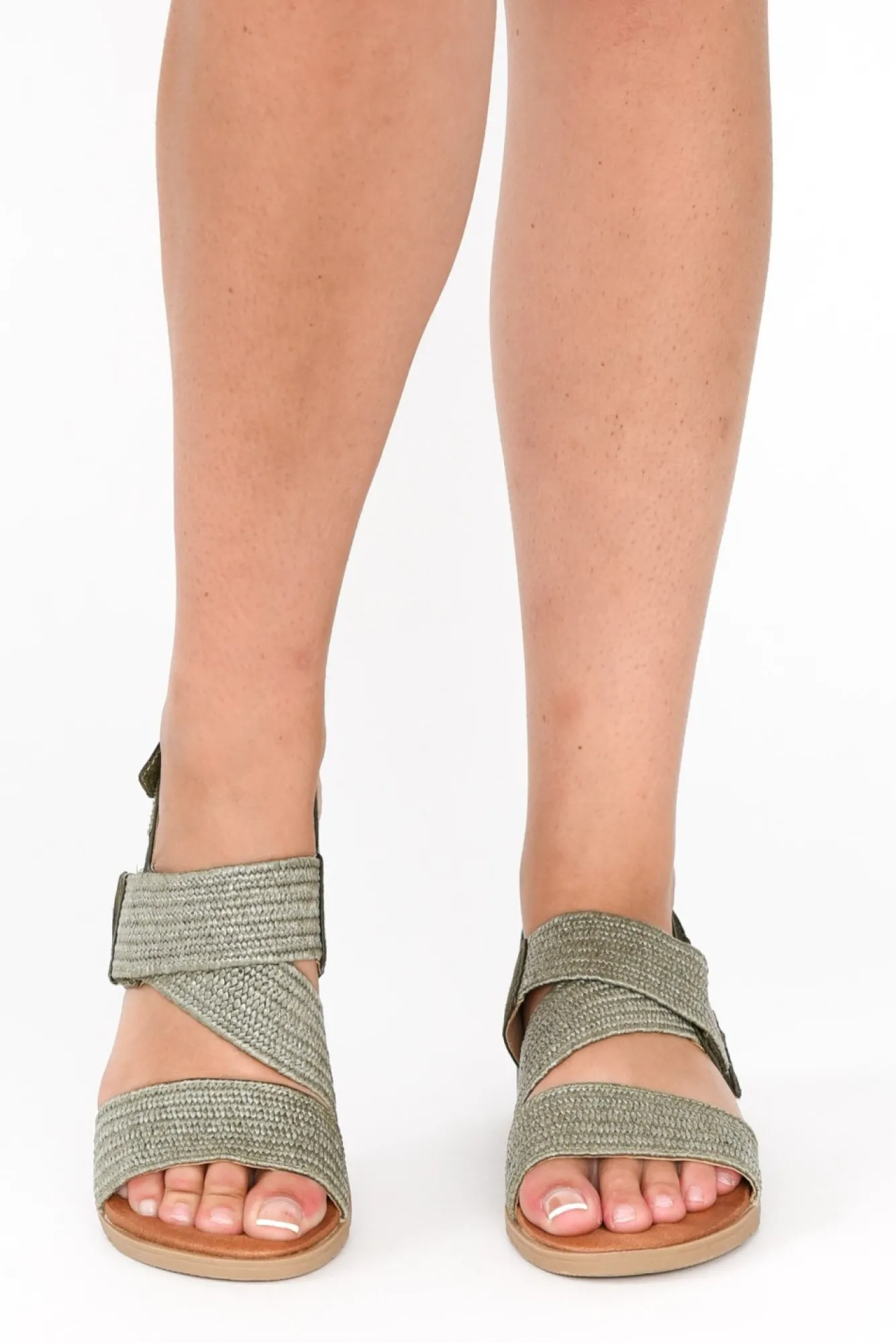 True To Size: Pick The Size You Would Normally BuyNNfit: Standard – WideNwardrobe Staple Sandal Featuring Flexible Raffia Straps And A Faux Suede Ankle Strap Nstraps Stretch Over The Toes, Bridge And Around The Ankle Nvelcro At The Ankle And Bridge Straps Makes This Style Adjustable To All FeetNfootbed Designed With Comfort In Mind Featuring Soft Cushioning And A Slightly Raised HeelNflexible Sole With Corrugated Texture For Non-Slip Peace Of MindNNupper: SyntheticNNlining: SyntheticNsole: SyntheticNcolour: Washed GreenNheel Height: 3.1Cm