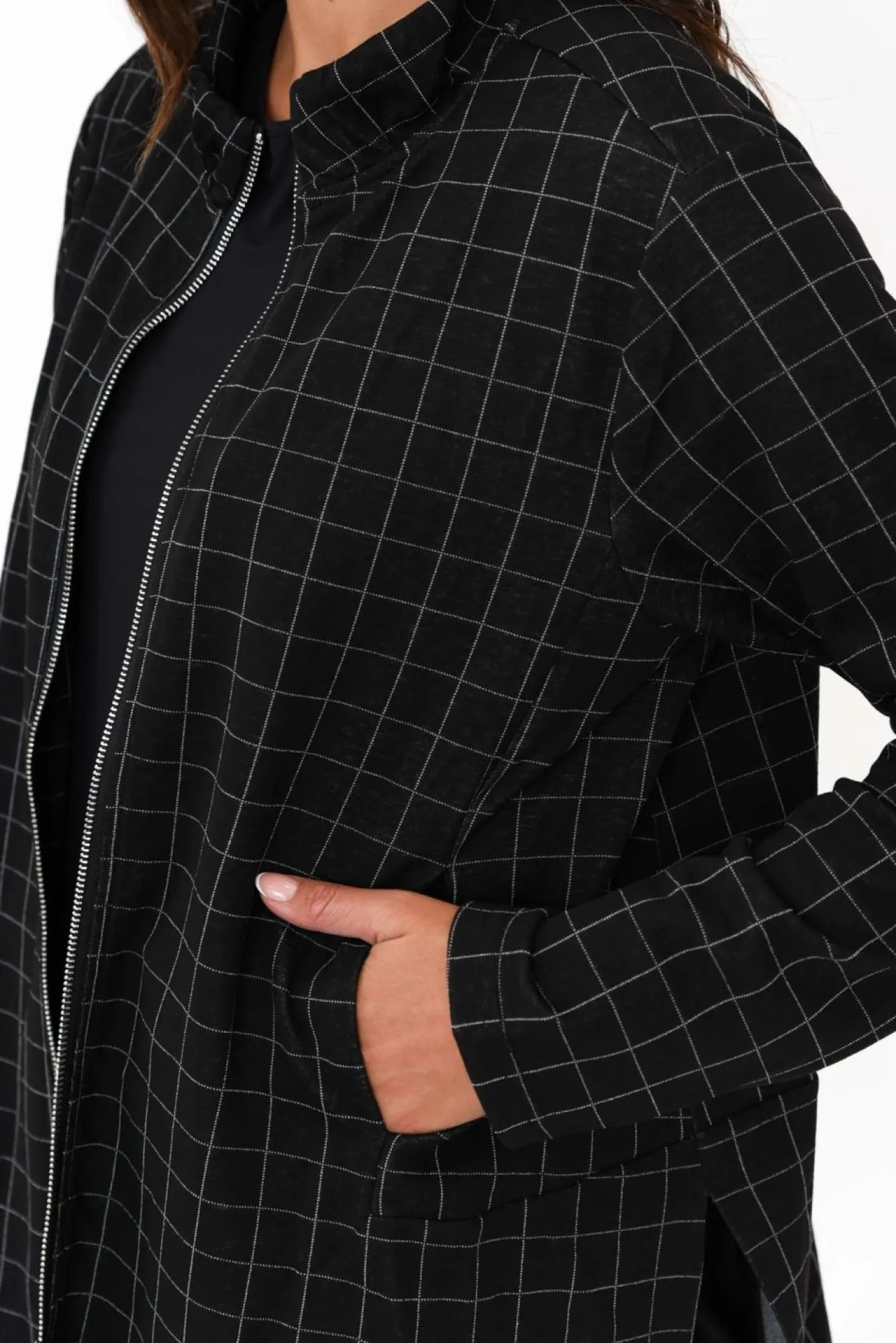 Fit: True To Size. Refer To Size & Fit Tab Below For Specific Size Recommendation NNfabric: 77% Polyester, 18% Viscose, 5% ElastaneNmade From Ultra-Comfortable, Midweight And Stretchy Jersey-Inspired Fabric Nhigh Neckline For A Refined Look Neasy Silver Zip Front From Neck To Just Above The Hemline NNstraight Full-Length Sleeves NNversatile A-Line Silhouette Enhanced By Subtle Flaring At The Hips NNtwo Handy Pockets Hidden In Front Seams Nfeaturing 21Cm Side Splits Nhi-Lo Hemline Falls To Hip Length NNNcare: Cool Gentle Hand Wash RecommendedNNcolour: Midnight Black Base With A Fine White Check Print