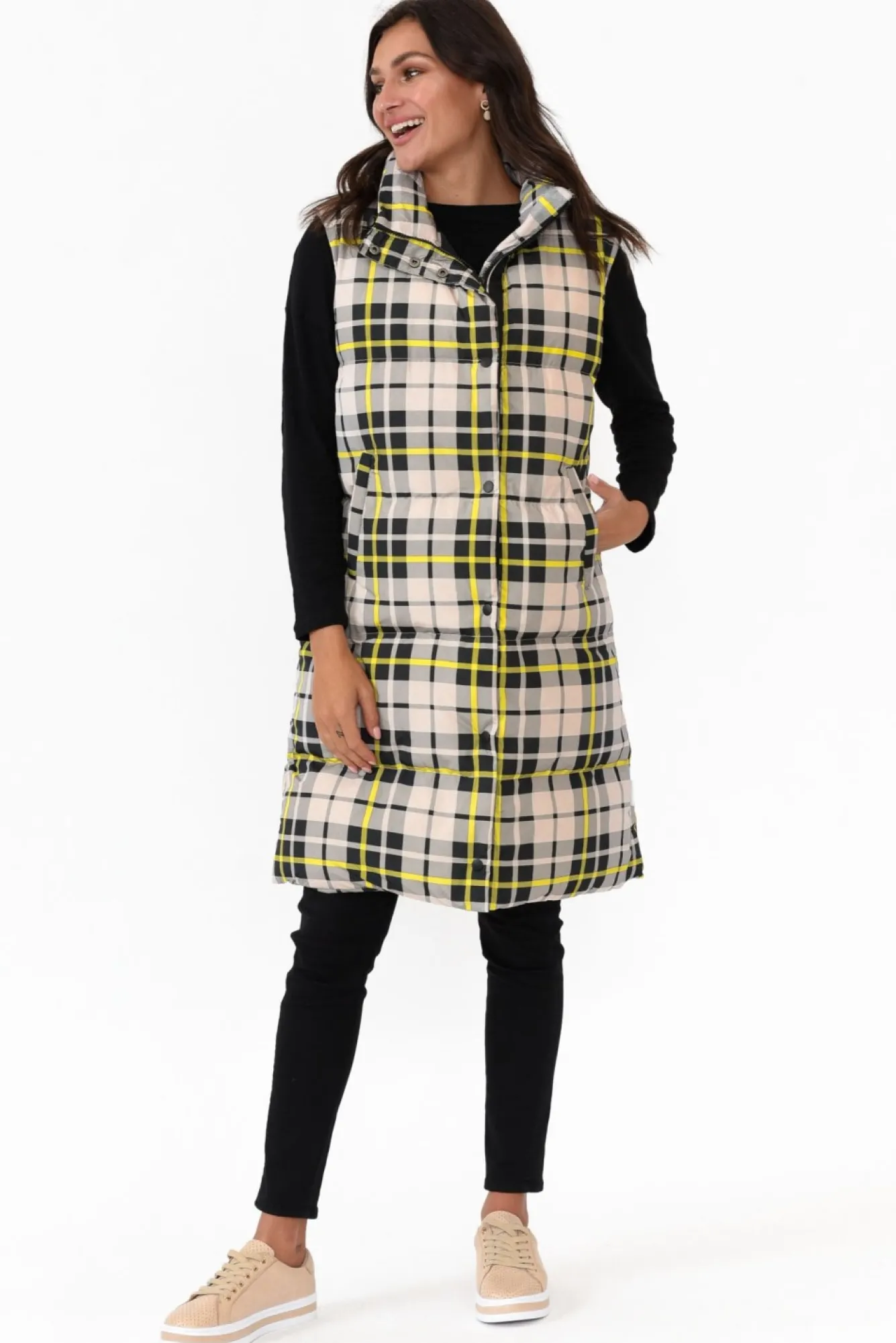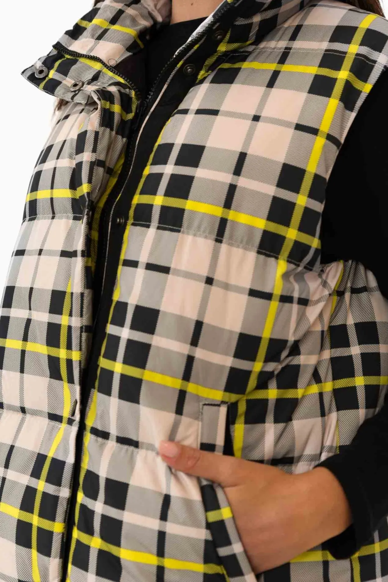 Fit: True To Size. Refer To Size & Fit Tab Below For Specific Size Recommendation NNfabric: 100% PolyesterNan Ultra-Cosy, Midweight Puffer-Style Vest With An Elevated Sheen And Soft Lining NNhigh-Collared Neckline With Adjustable Pull Toggles NNclassic Sleeveless Vest Design – Perfect For Layering Nfull-Length Zip Front With Bonus Snap Closures From Neck To Base Nmodern Longline Silhouette Enhanced By Full-Length Zip Front Ntwo Feature Front Pockets With Concealed Zip Closure NNstraight Hemline Falls Above The Knees NNNcare: Cool Gentle Machine Wash RecommendedNNcolour: Striking Neon Yellow And Black Check Print Over A Taupe Base