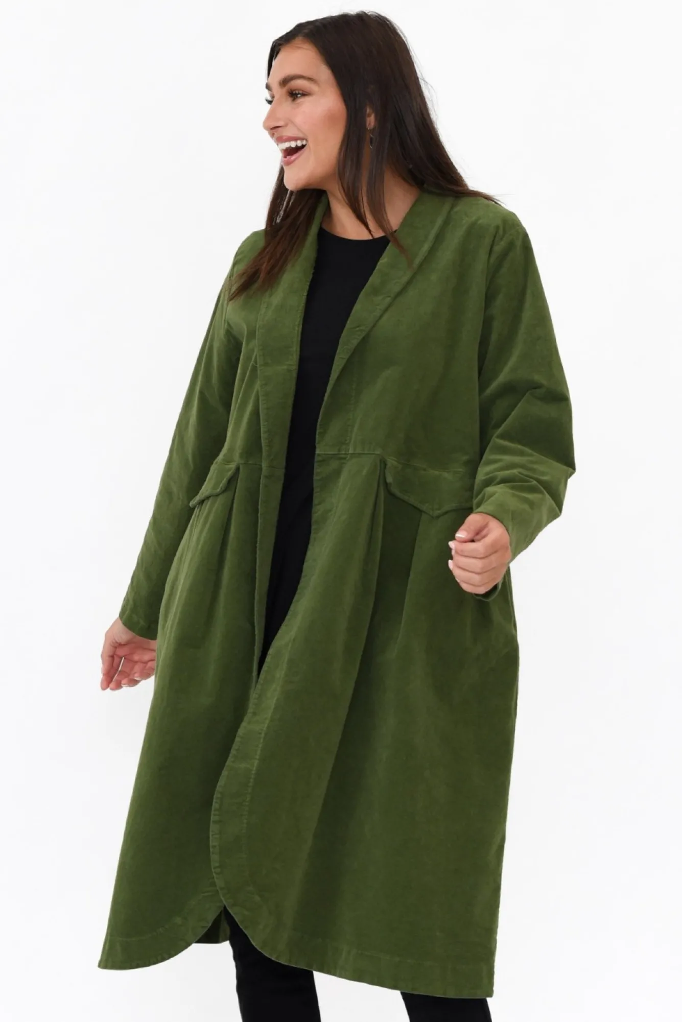 Fit: One Size. Refer To Size & Fit Tab Below For Specific Size Recommendation NNfabric: 97% Cotton, 3% Spandex Nlightweight, Structured Velvet Feel Fabric With A Small Amount Of StretchNfold Over Full-Length CollarNlong SleevesNfaux Pocket Flaps On The Waist With Functional Pockets In The Side SeamNgathered Pleats From The Waist Add Volume To The Silhouette Na-Line Silhouette Nbelow Knee LengthNcurved Hem On The Front And Straight Hem On The BackNNcare: Cool Gentle Hand Wash RecommendedNNcolour: Emerald Green Shade