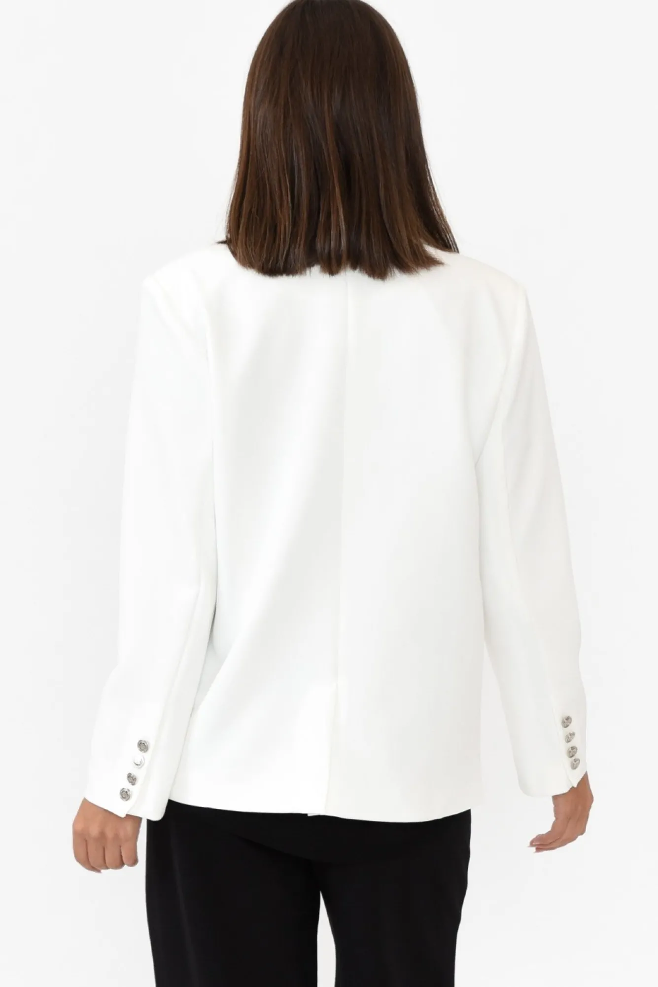 Fit: True To Size. Refer To Size & Fit Tab Below For Specific Size RecommendationNNNfabric: Main: 95% Polyester, 5% Elastane Lining: 100% Polyester Nan Elegant And Timeless Blazer Made From Midweight Fabric With A Soft And Smooth Lining Through The Torso And Arms NNsignature Collared Neckline Complete With Notched LapelsNstraight Full-Length Sleeves With Four Fixed Buttons At The Cuff Nboxy Silhouette Exaggerated By Shoulder Pad Detail NNstriking Double-Breasted Design Elevated By Statement Silver Embossed Buttons NNtwo Functional Front PocketsNfalls Below The Hips NNcare: Cool Gentle Hand Wash RecommendedNNcolour: Fresh White Shade