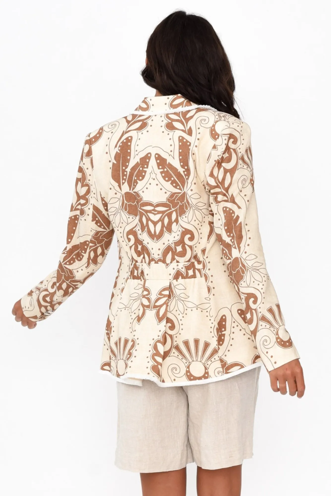 Fit: True To Size. Refer To Size & Fit Tab Below For Specific Size RecommendationNNfabric: Main: 70% Viscose, 30% Linen Lining: 100% PolyesterNcrafted From Luxurious Linen Blend Fabric With A Classic Woven FinishNNfully Lined With A Silky Soft Fabric For Perfect Coverage Nfeaturing Notched Lapels And A Single Button Closure For A Timeless Look NNlovely White Fringe Trim Featured On Lapels And Hem Nfull-Length Sleeves With A Four Fixed Buttons At The Cuff NNclassic Blazer Silhouette Enhanced By Shoulder Pad Detail NNruched Elasticated Detail At The Back Creates Soft Pleating Ntwo Featured Front Pockets NNstraight Hemline Falls To The Hips NNNcare: Dry Clean OnlyNNcolour: Natural Cream Base With A Brown Abstract Floral Print