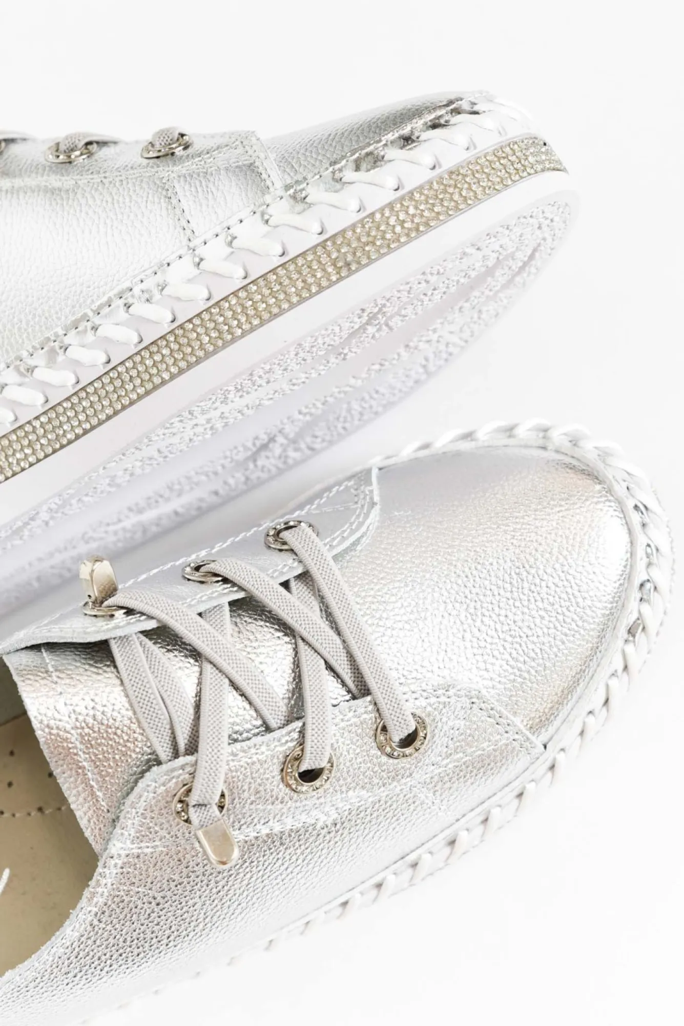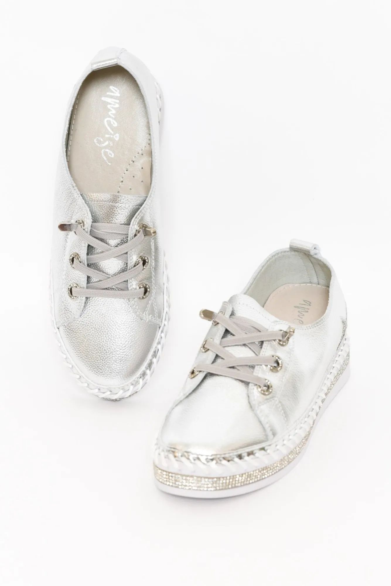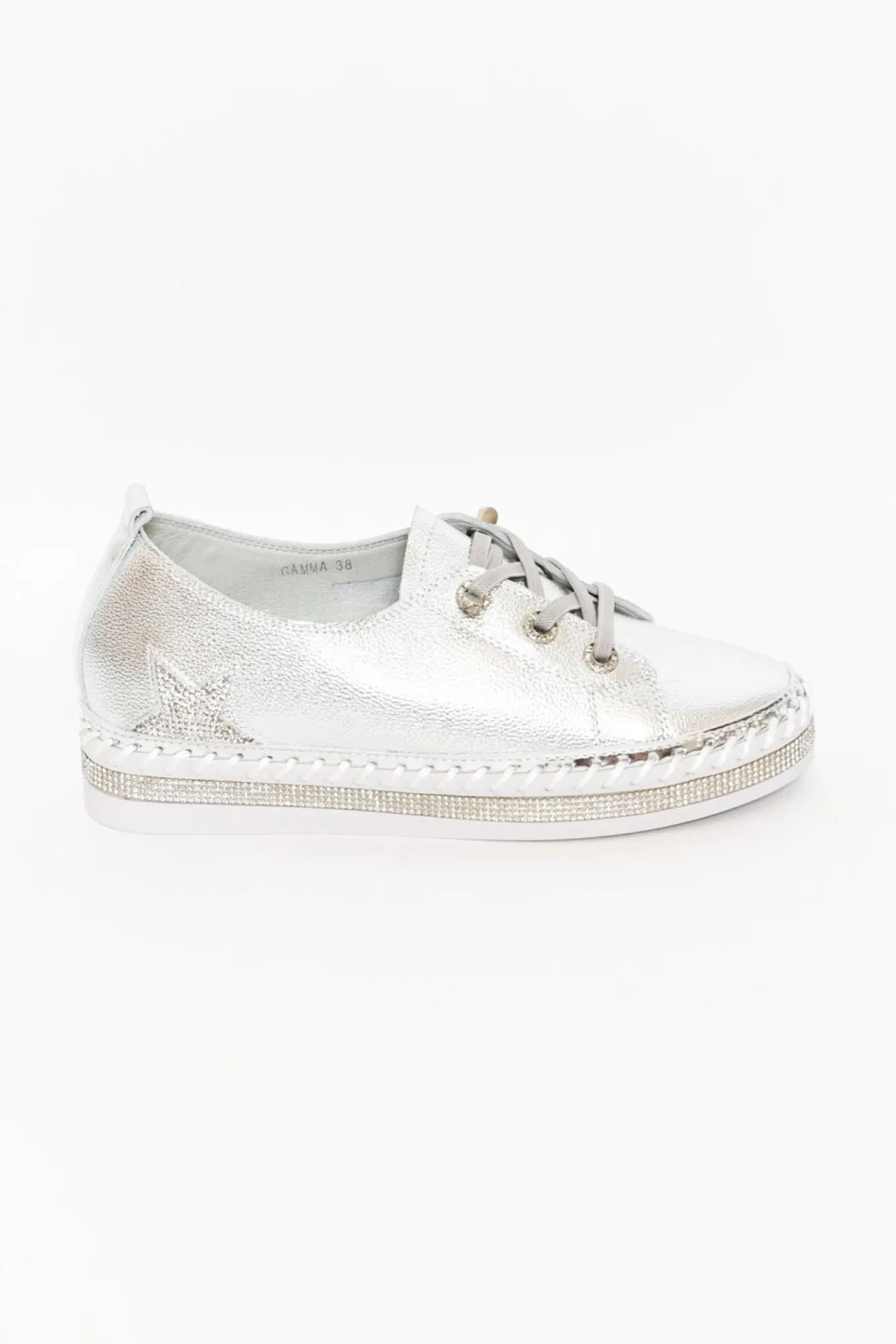 True To Size: Pick The Size You Would Normally Buy NN Fit: Standard – Wide Nstatement Platform Sneaker Designed Using Premium Leather In A Metallic Silver Nno Need To Do Up The Laces, They Are Reinforced With A Bead Eyelet For An Open Lace Design! Npanel Of Diamantes On The Base Of The Shoe And Thick Exposed Stitching Details For An Extra Stylish TouchNslight Incline In The Heel Of The Insole For Extra ComfortNgrooved Tread Sole Enhances Flexibility And GripNdiamante Embellished Star On The Outside HeelNNupper: LeatherNNlining: Man-MadeNsole: Man-MadeNheel Height: 3Cm Nshoe Care: Use A Water And Stain-Repellent Spray To Protect Before Wearing. To Clean Use A Damp Cloth And Spot Clean.