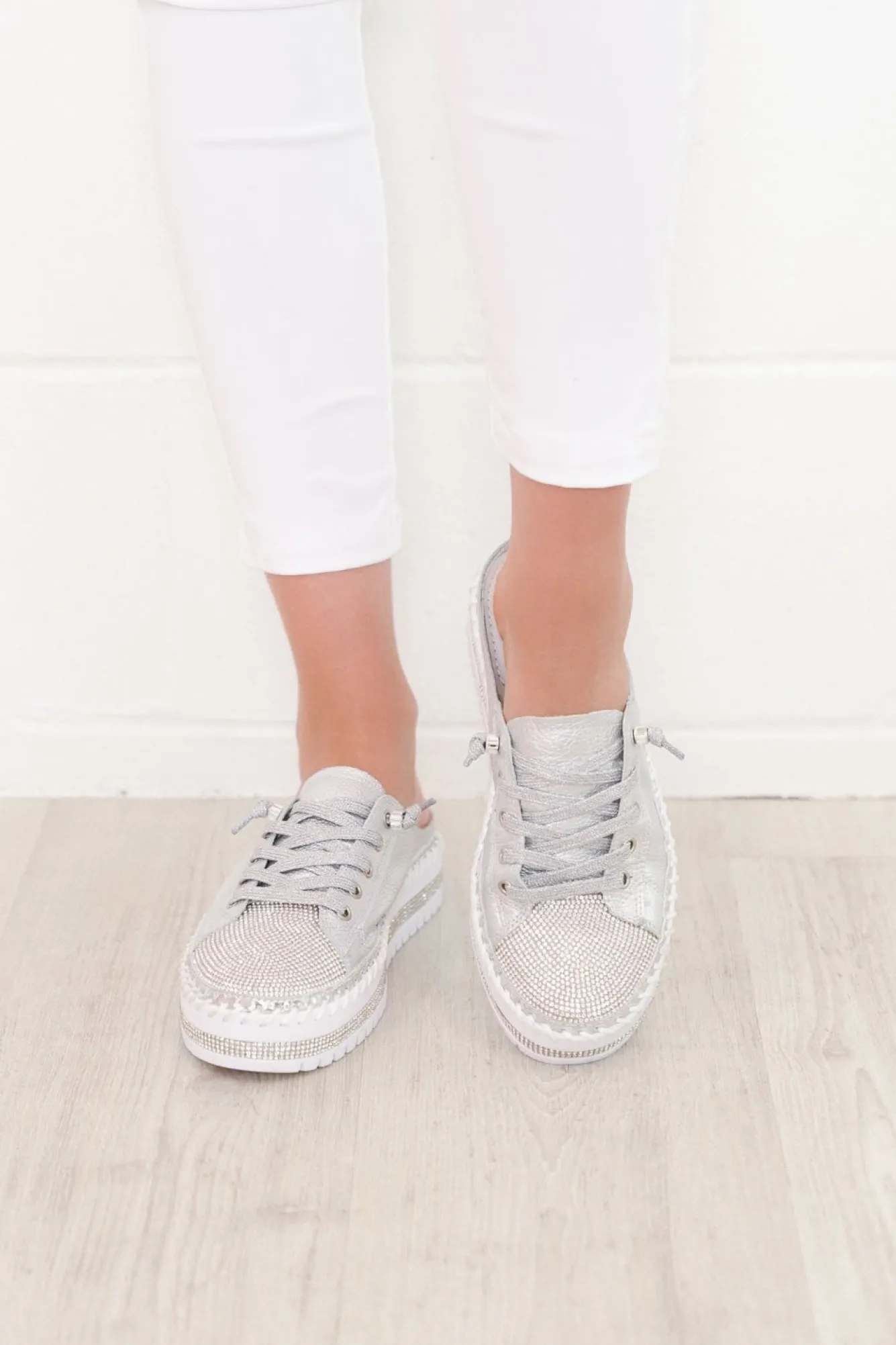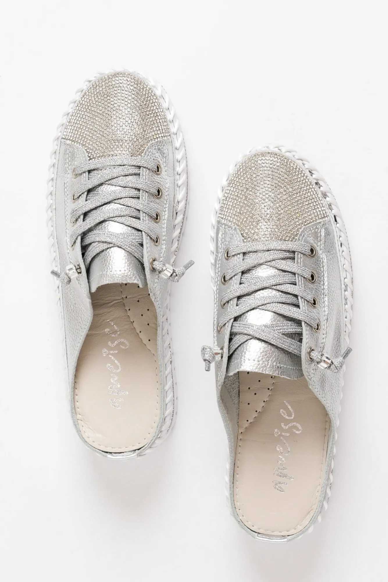 True To Size: Pick The Size You Would Normally BuyNNNfit: Standard – WideNslide On Mule Style With A Laced Front And Silver EyeletsNstrip Of Diamantes On The Base Of The Shoe, A Strip Of Metallic Silver And Thick Exposed Stitching Detailing For An Extra Stylish TouchNno Need To Do Up The Laces, They Are Reinforced With A Bead For An Open Lace Design!Nopen Heel DesignNthick Cushioned Inner SoleNsilver Base With A Silver Diamante Panel On The Front AreaNincludes A Small Bag Of Replacement Sequins To Keep Your Shoes Shining Bright! Nupper: LeatherNNlining: LeatherNsole: Man MadeNheel Height: 3CmNNshoe Care:Spot Clean Only. Use A Damp Cotton Wool Swab Stick To Clean The Affected Areas. Dry Afterwards.Nbrowse More Shoes In Comfy Mule Collection Or From Ameise