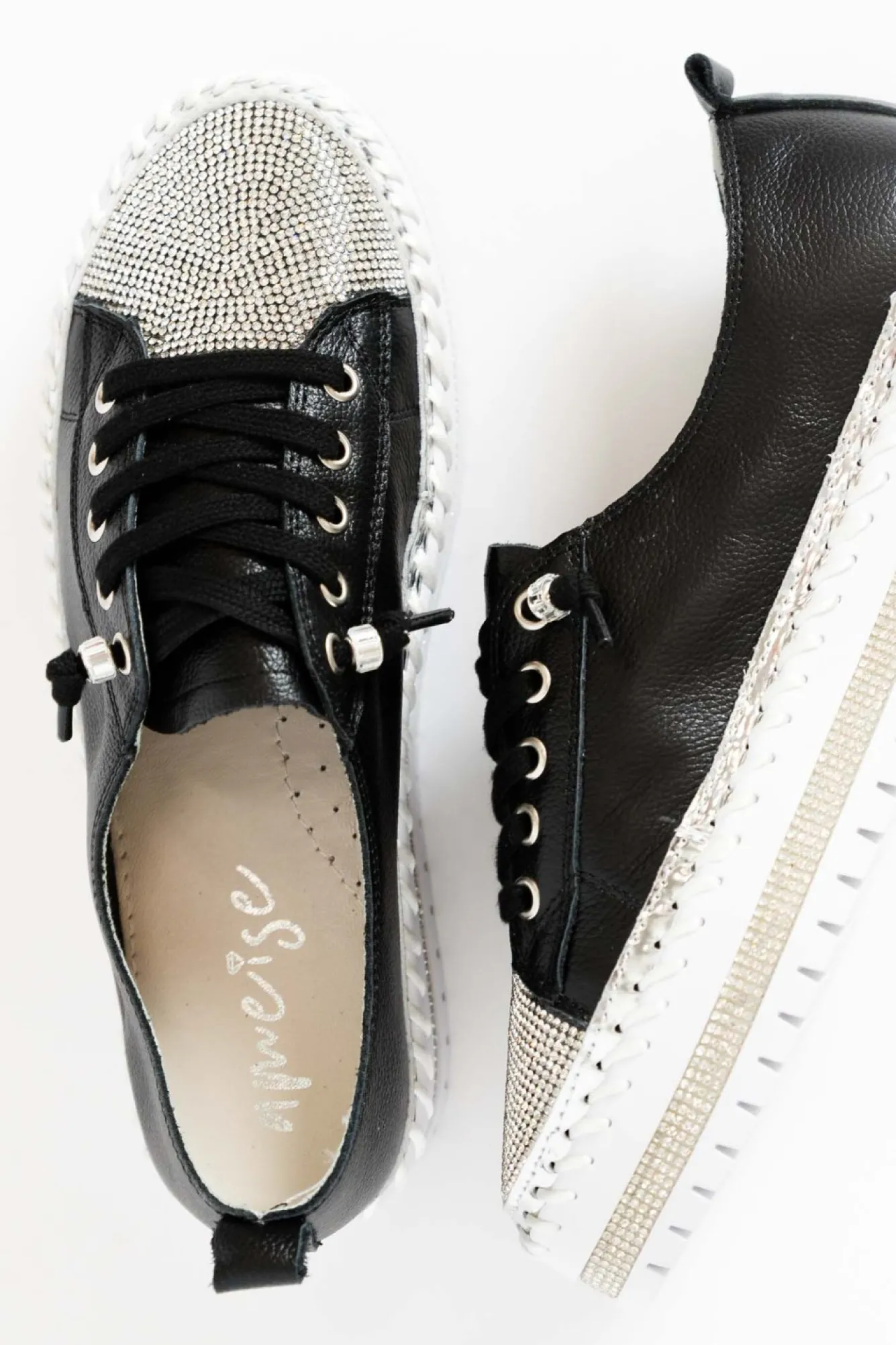 Runs Slightly Small: If In Between Sizes, We Recommend Sizing UpNNfit: Standard – WideNplatform Sneaker Design With Some Dazzle!Nblack Laces With Faux-Crystal EyeletsNno Need To Do Up The Laces, They Are Reinforced With A Bead For An Open Lace Design!Nthick Cushioned Inner SoleNstrip Of Diamantes On The Base Of The Shoe And Thick Exposed Stitching Detailing For An Extra Stylish TouchNblack Upper Colour With Diamante Toe DetailNchunky Platform Heel With Grooved Tread Enhancing Flexibility And GripNincludes A Small Bag Of Replacement Sequins To Keep Your Shoes Shining Bright! Nupper: LeatherNNlining: LeatherNsole: Man MadeNNheel Height: 3CmNN Product Care: Spot Clean Only. Use A Damp Cotton Wool Swab Stick To Clean The Affected Areas. Dry Afterwards.