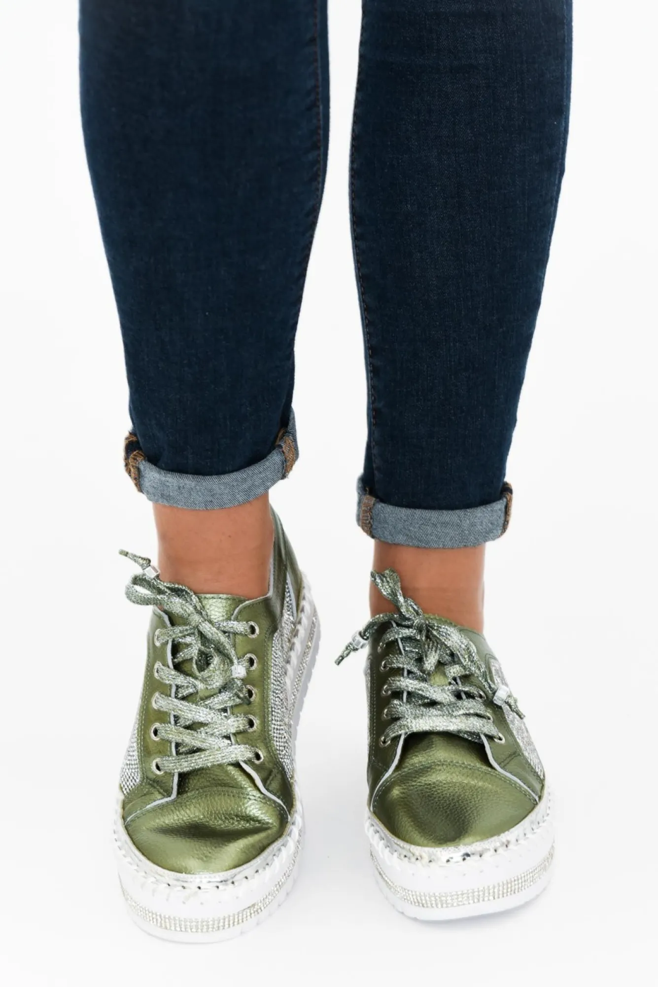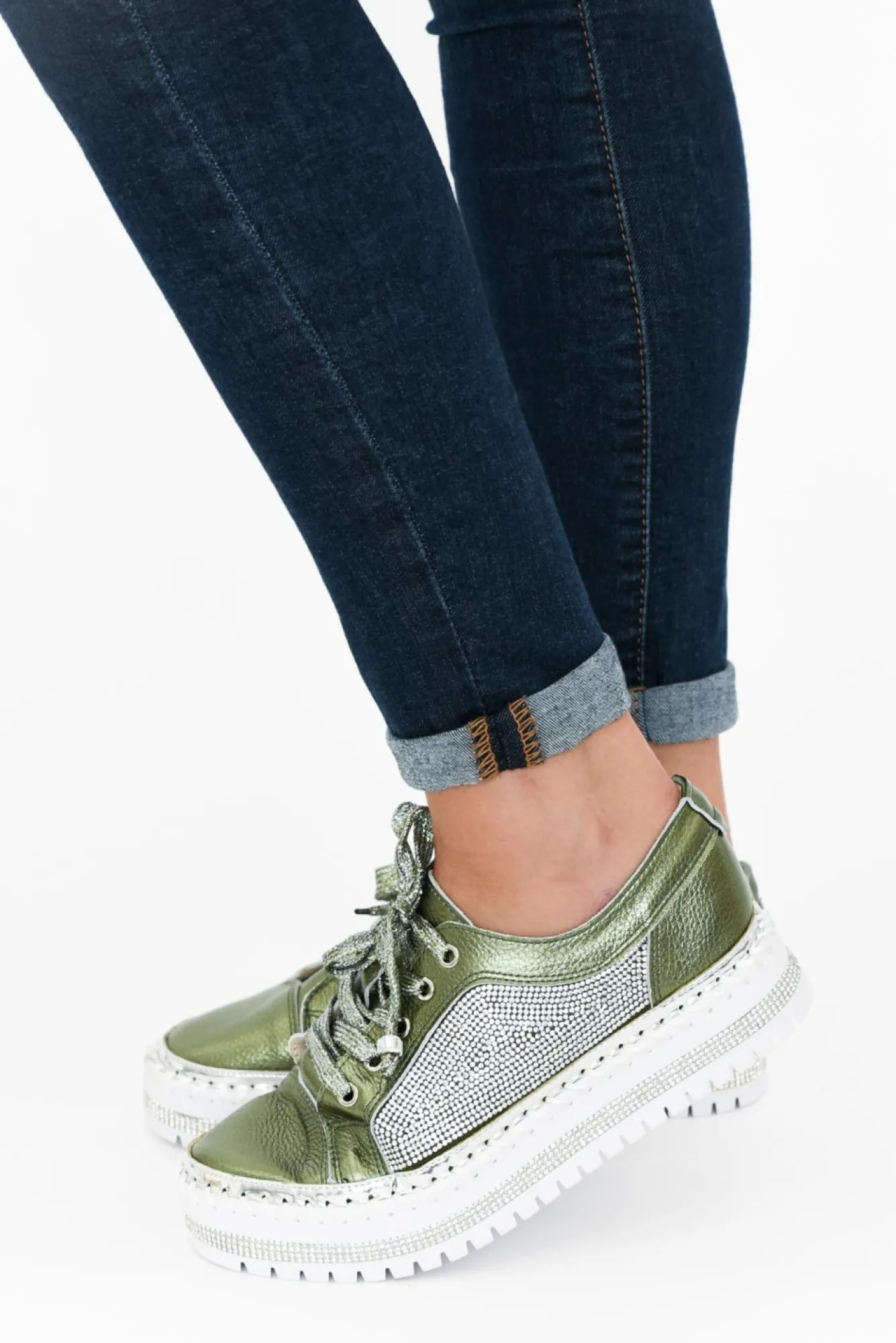 True To Size: Pick The Size You Would Normally BuyNNfit: Standard – WideNstand Out Wearing This Bedazzled Platform Sneaker In A Metallic Khaki ShadeNcrafted From Genuine, Soft Leather For All-Day Comfort Nstatement Panel Of Diamantes On The Sides Of The Shoe Enhance The Luxe LookNNsparkly Green Laces With Silver Bead Accents Nfeaturing A Strip Of Eye-Catching Diamantes And Thick Exposed Stitching On The Base Of The Shoe Nchunky Platform Heel With Grooved Tread Enhances Flexibility And GripNcomfortable Inner Sole With Layers Of Cushioning NNupper: LeatherNNlining: LeatherNsole: SyntheticNheel Height: 3.5CmNshoe Care: Spot Clean Only. Use A Damp Cotton Wool Swab Stick To Clean The Affected Areas. Dry Afterwards.Nnote: Please See Photos Rather Than Video For Most Accurate Colour.