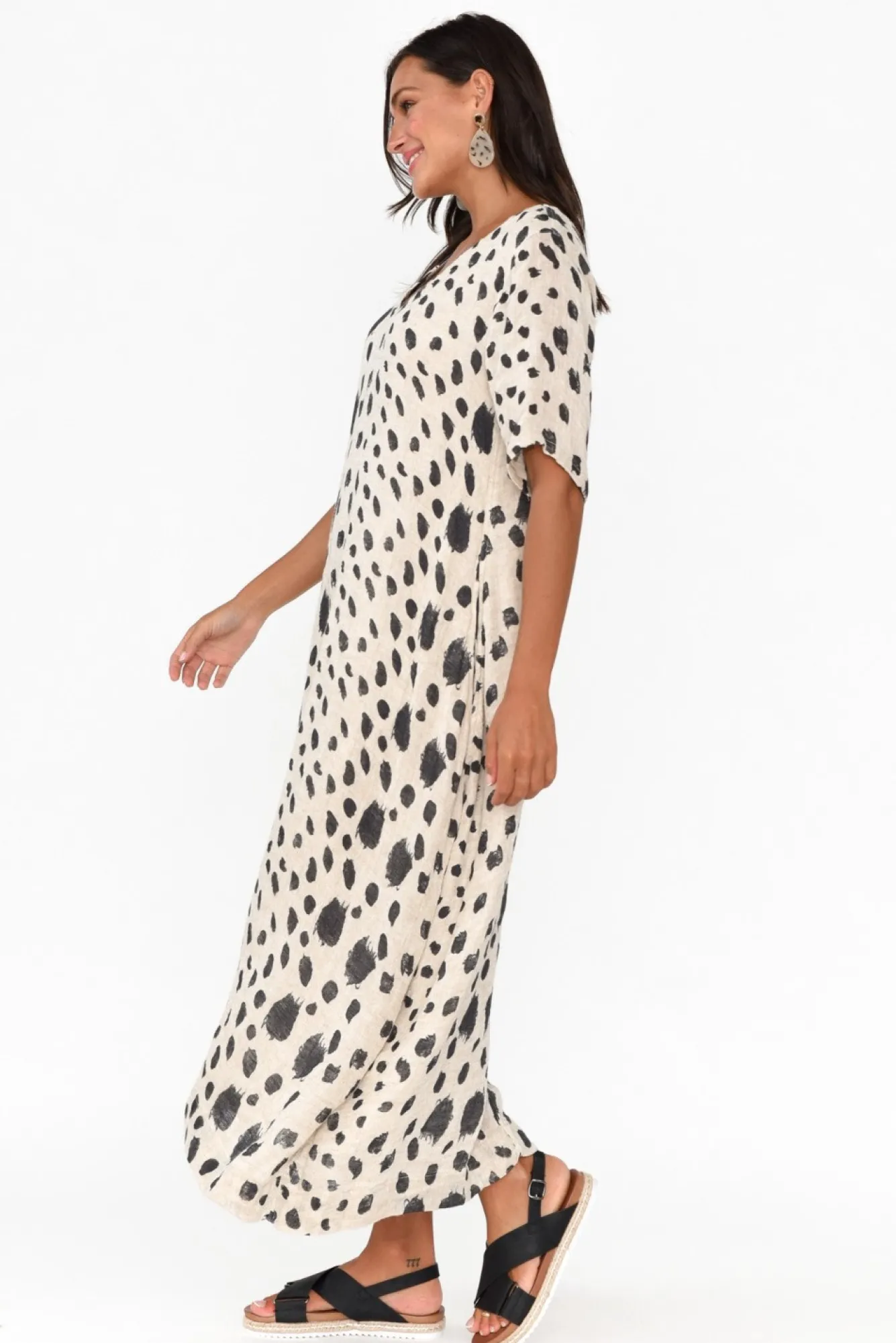 Fit: True To Size. Refer To Size & Fit Tab Below For Specific Size RecommendationNNfabric: 100% LinenNgorgeous Lightweight, Breathable And Non-Stretch Linen Designed With A Loose Woven FinishNNfully Lined From Shoulder To BaseNsoft V-Neckline Flatters The Collarbones NNstraight Half-Length Sleeves NNrelaxed Balloon Silhouette With Subtle Tapering Towards The Hem NNtwo Hip Pockets Located In Side Seams NNstraight Hemline Falls To Midi Length NNNcare: Cool Gentle Hand Wash RecommendedNNcolour: Beige Base With A Black Abstract Spot Print