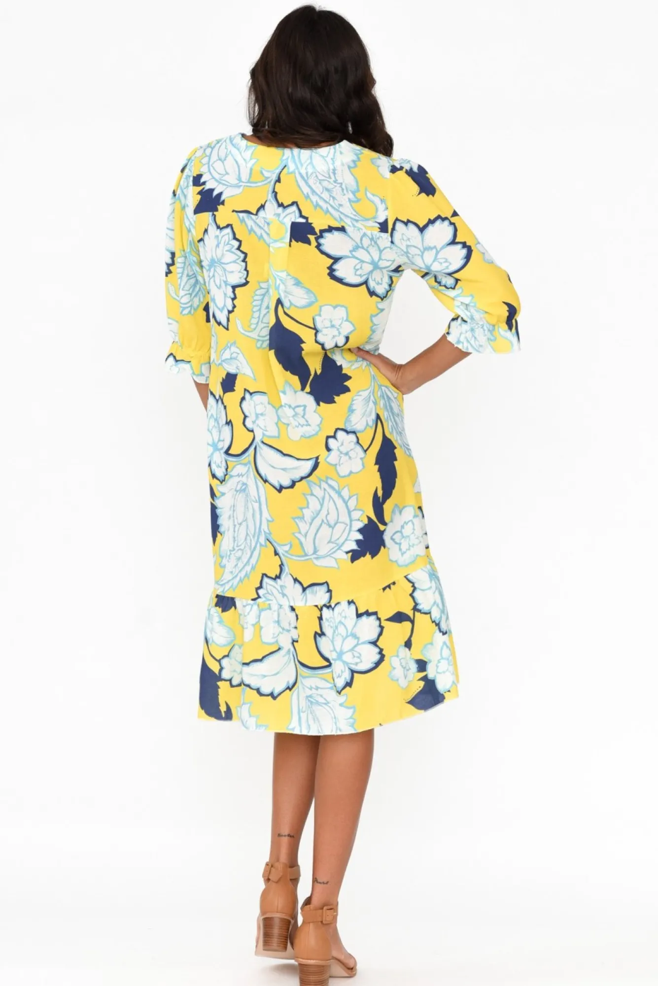 Fit: True To Size. Refer To Size & Fit Tab Below For Specific Size Recommendation NNfabric: 50% Linen, 50% ViscoseNlightweight, Non-Stretch Linen Blend Fabric With A Woven FinishNNcrafted In ItalyNsharp V-Neckline Highlights The Collarbones NN3/4 Length Puff Sleeves With An Elasticated Frill Cuff NNbreezy A-Line Silhouette NNtwo Discreet Hip Pockets Located In Side Seams NNfrill Hemline Falls Below Knee Length NNNcare: Cool Gentle Machine Wash RecommendedNNcolour: Lemon Yellow Base With A Lush Navy And Blue Floral Print