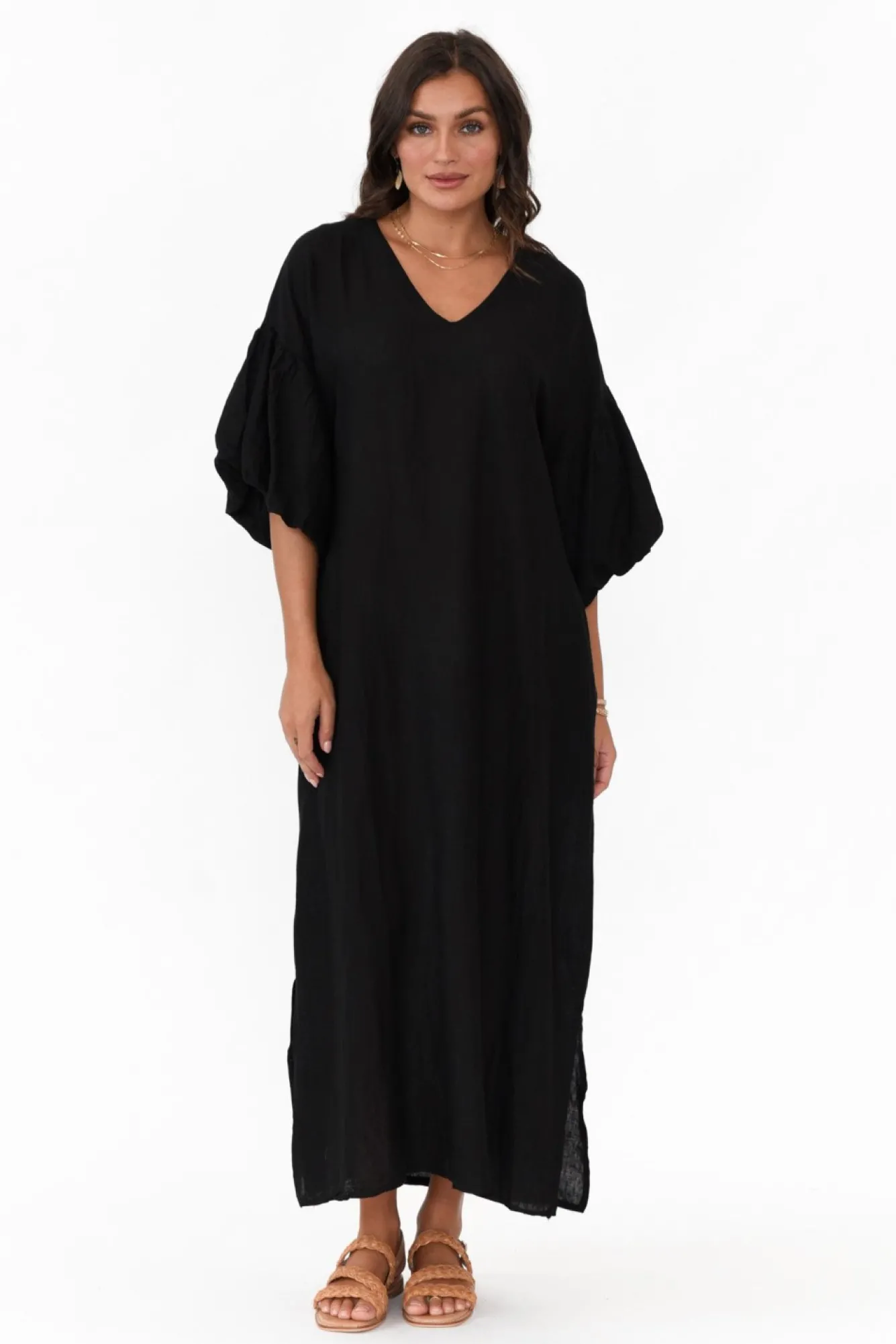 Fit: True To Size. Refer To Size & Fit Tab Below For Specific Size RecommendationNNfabric: 80% Linen, 20% CottonNcrafted In Italy From Lightweight, Breathable And Non-Stretch FabricNNslightly Sheer Fabric, We Recommend Wearing Nude UndergarmentsNsharp V-Neckline Defined By Band Stitch Detail NNdramatic Puff Half-Length SleevesNNflattering A-Line Silhouette NNtwo Discreet Hip Pockets NNstraight Hemline Featuring Side SplitsNNdrapes To Maxi LengthNNcare: Cool Gentle Machine Wash RecommendedNNcolour: Classic Black