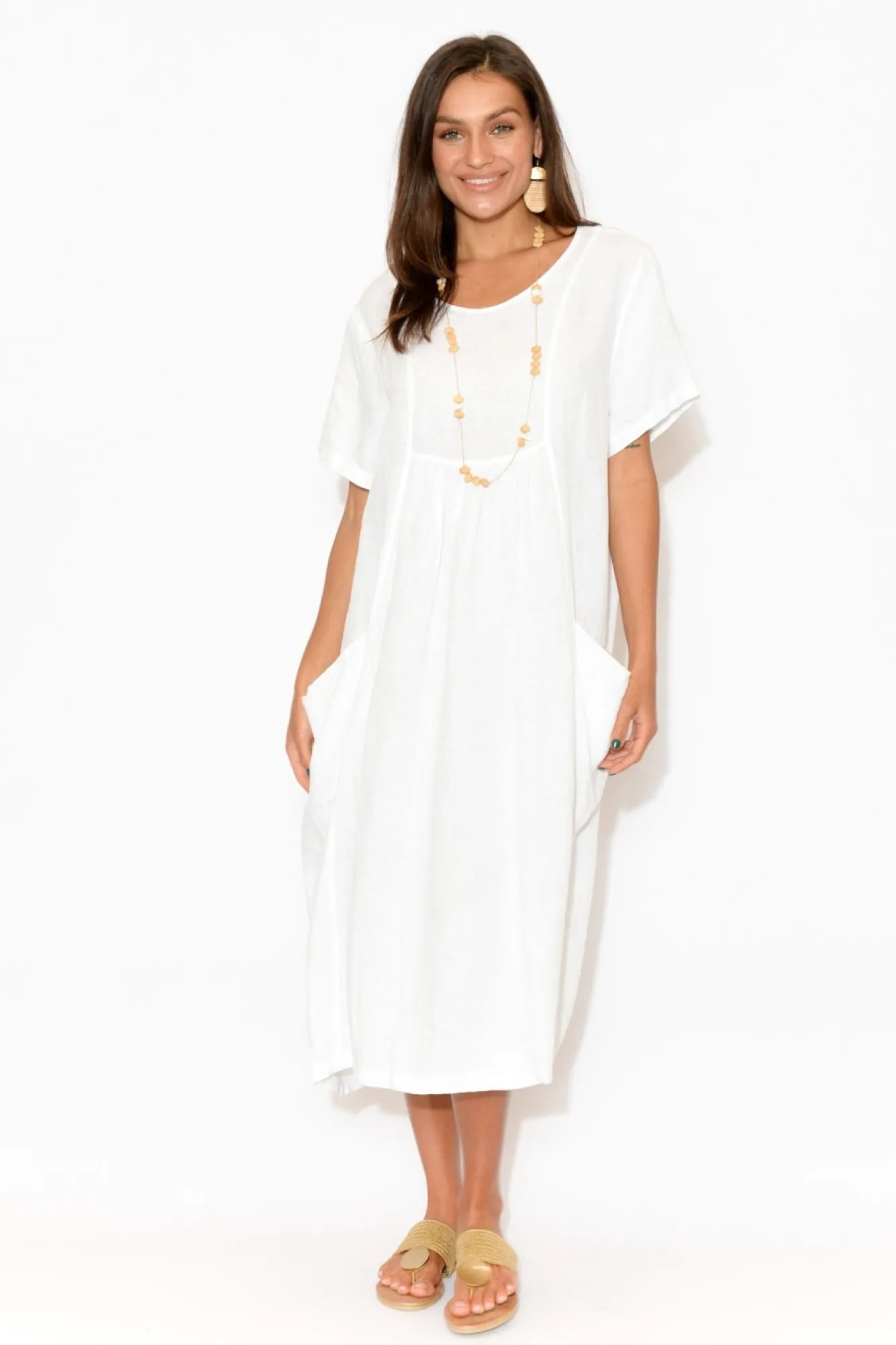 Fit: One Size. Refer To Size & Fit Tab Below For Specific Size Recommendation NNfabric: 100% LinenNmade In ItalyNlightweight, Soft And Breathable Non-Stretch LinenNround NecklineNshort SleevesNvertical Panelled Front With A Gathered Under Bust Centre SeamNvertical Panelled BackNtwo External Hip PocketsNa-Line SilhouetteNmidi LengthNNcare: Cool Gentle Hand Wash RecommendedNNcolour: Timeless White