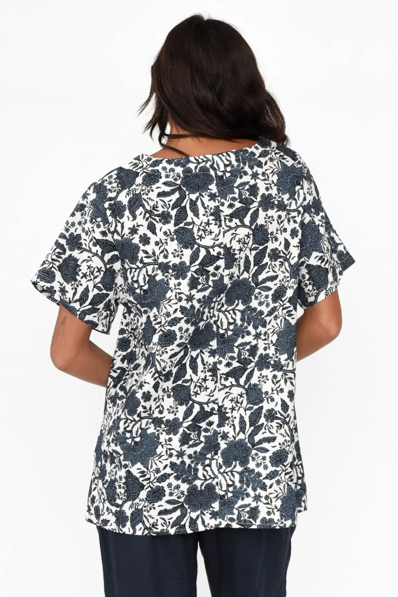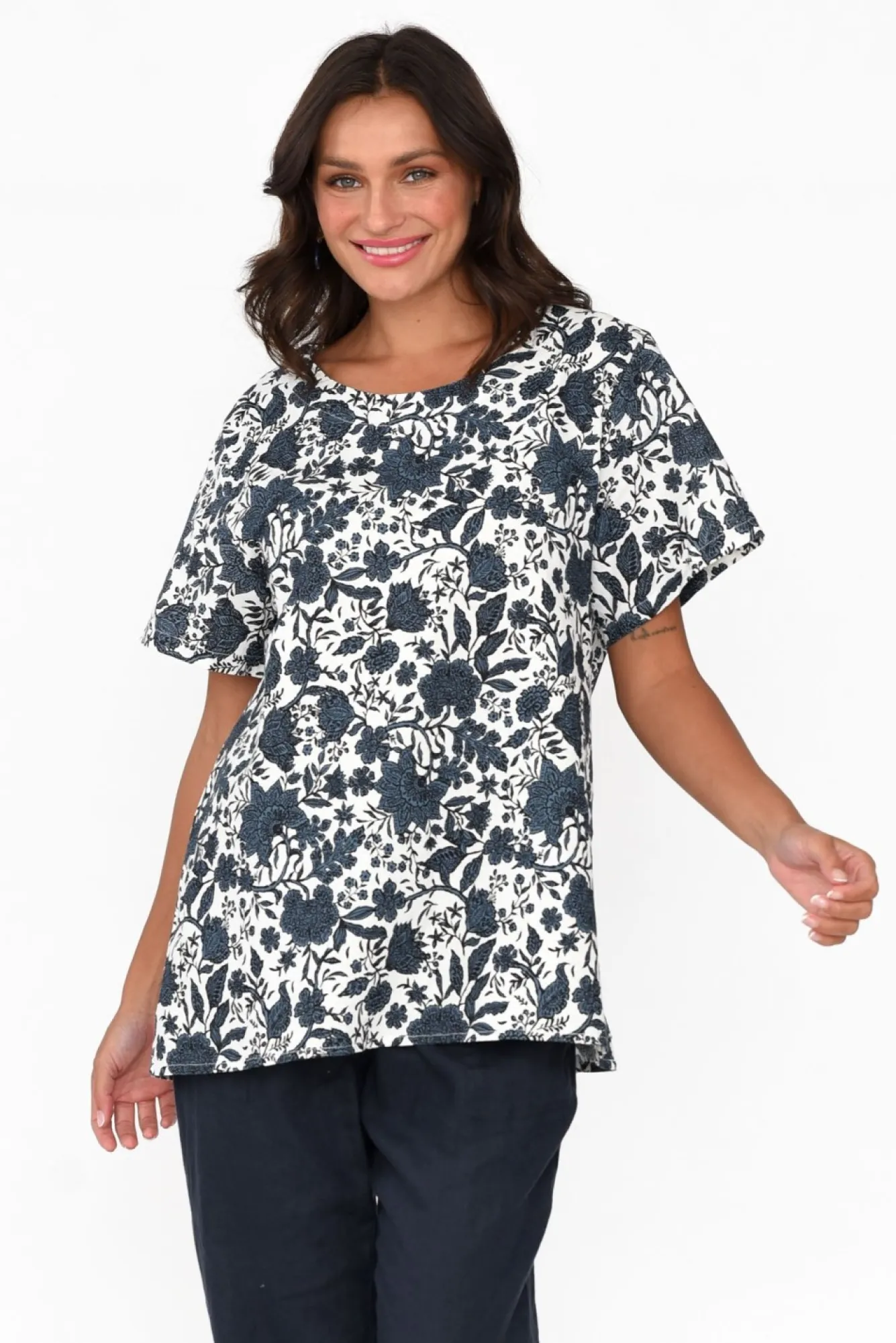 Fit: Measurements May Vary Between Colourways. Refer To Size & Fit Tab Below For Specific Size RecommendationNNNfabric: 100% LinenNmidweight, Breathable And Non-Stretch Linen With A Signature Woven Hand Feel Nround Banded Neckline NNclassic Tee Sleeves Extend Just Above The ElbowNNslight A-Line Silhouette Creates A Swing Effect At The HipsNstraight Hem Falls To The HipsNNNcare: Cool Gentle Machine Wash RecommendedNNcolour: White Base With A Navy And Black Floral OverlayNNnote: Fabric Textures May Vary Between Colourways, Please Refer To Individual Product Descriptions.
