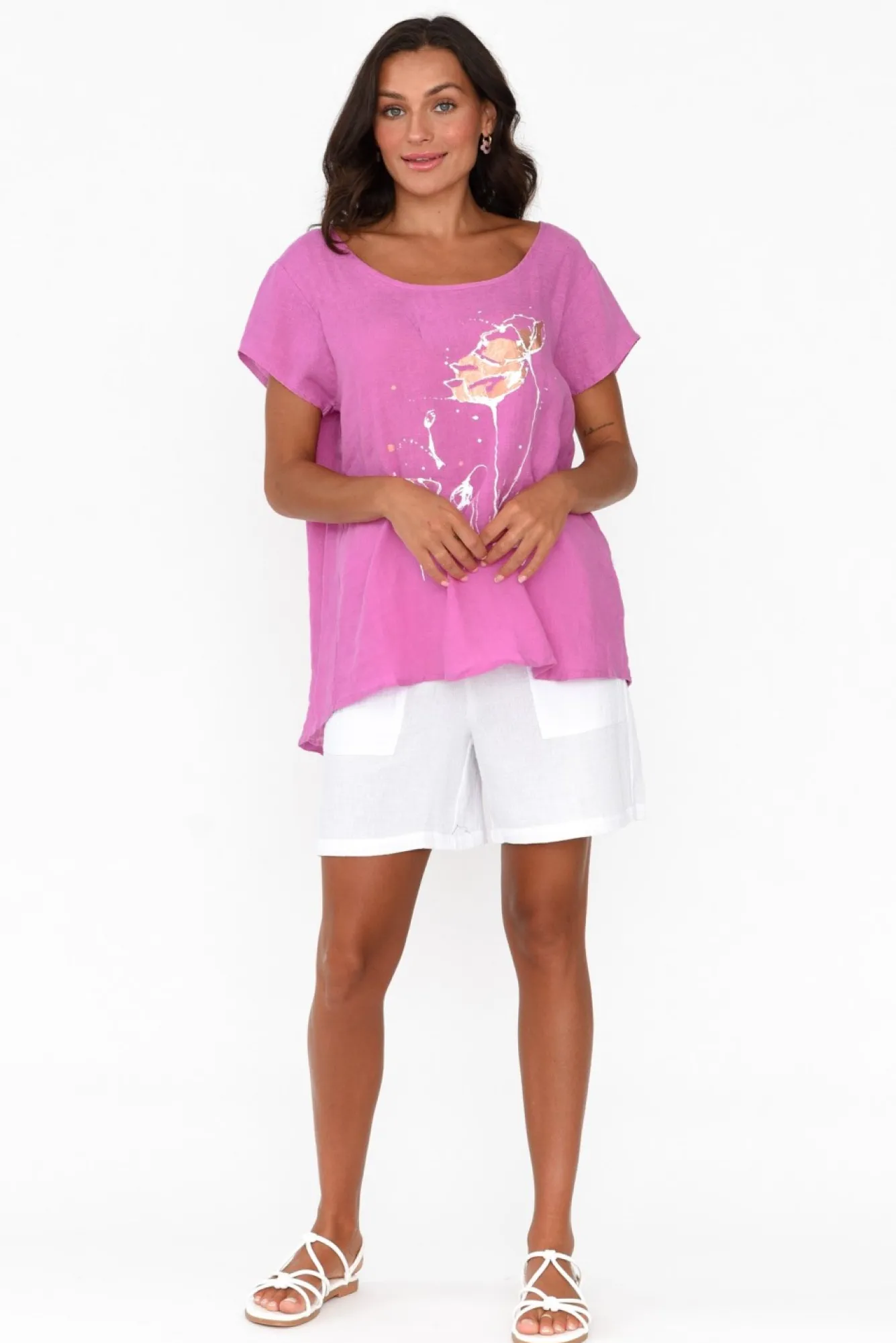 Fit: True To Size. Refer To Size & Fit Tab Below For Specific Size RecommendationNNfabric: 100% LinenNcrafted From A Classic Woven Linen Offering Wonderful Breathability And A Lightweight, Non-Stretch Hand FeelNNwide Round Neckline Accentuates Collarbones NNshort Tee-Style Sleeves And Drape Silhouette Create A Timeless, Everyday StyleNstylish Foil Printed Abstract Flower GraphicNtriangular Pleating At The Back Offers Unrestricted Comfort And MovementNNslight Hi-Lo Hemline Falls Below The HipsNNNcare: Cool Gentle Machine Wash RecommendedNNcolour: Light Magenta With A White And Copper Print