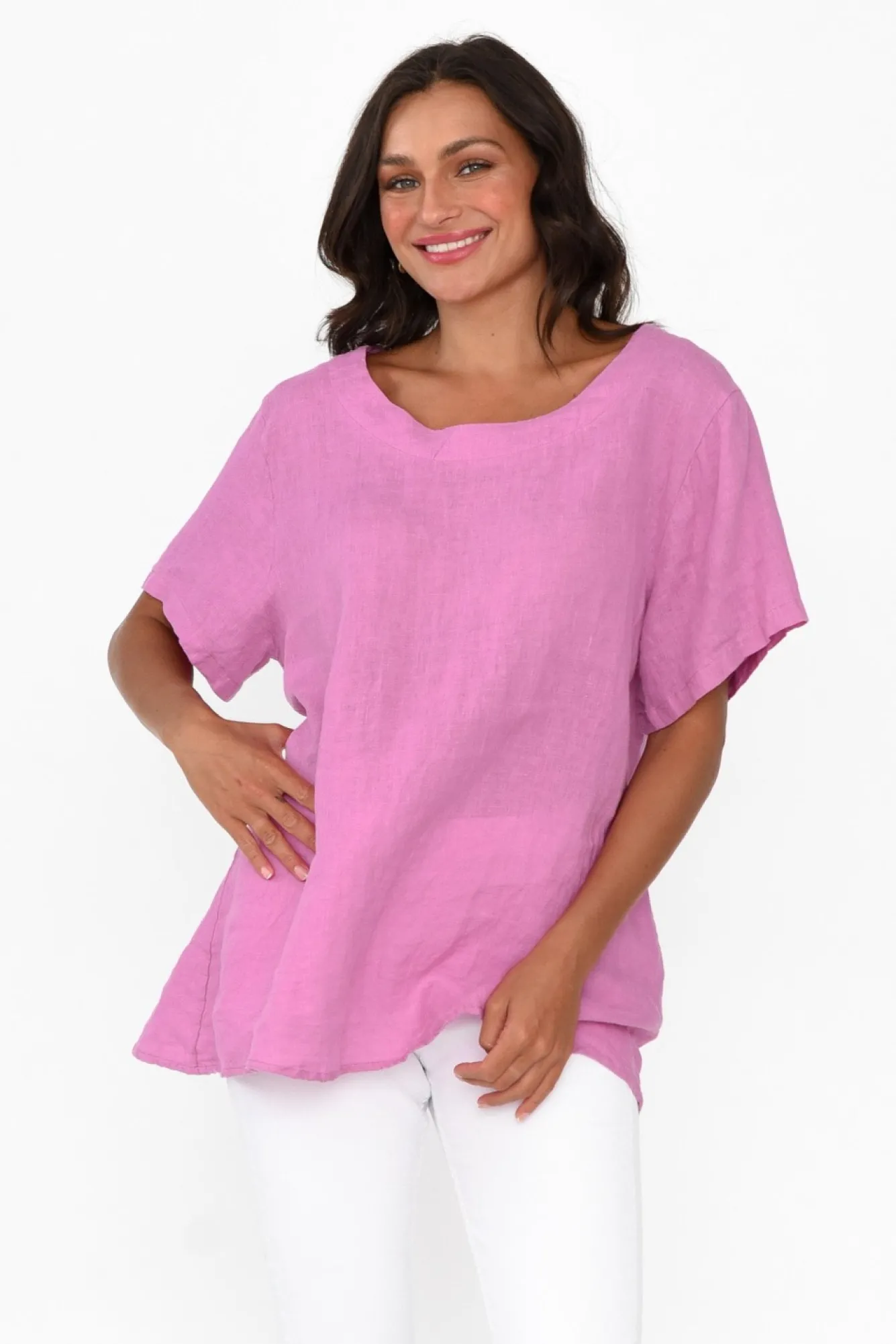 Fit: True To Size. Refer To Size & Fit Tab Below For Specific Size RecommendationNNfabric: 100% LinenNlightweight, Breathable And Non-Stretch Linen With A Signature Woven Feel NNrounded Neckline With Double Fold Detail StitchingNNmid-Length Tee-Style SleevesNNa-Line Silhouette Falls To A Hip-Skimming LengthNNcurved Hem Provides More Coverage Over The HipsNNcare: Cool Gentle Machine Wash RecommendedNNcolour: Gorgeous Light Magenta Shade