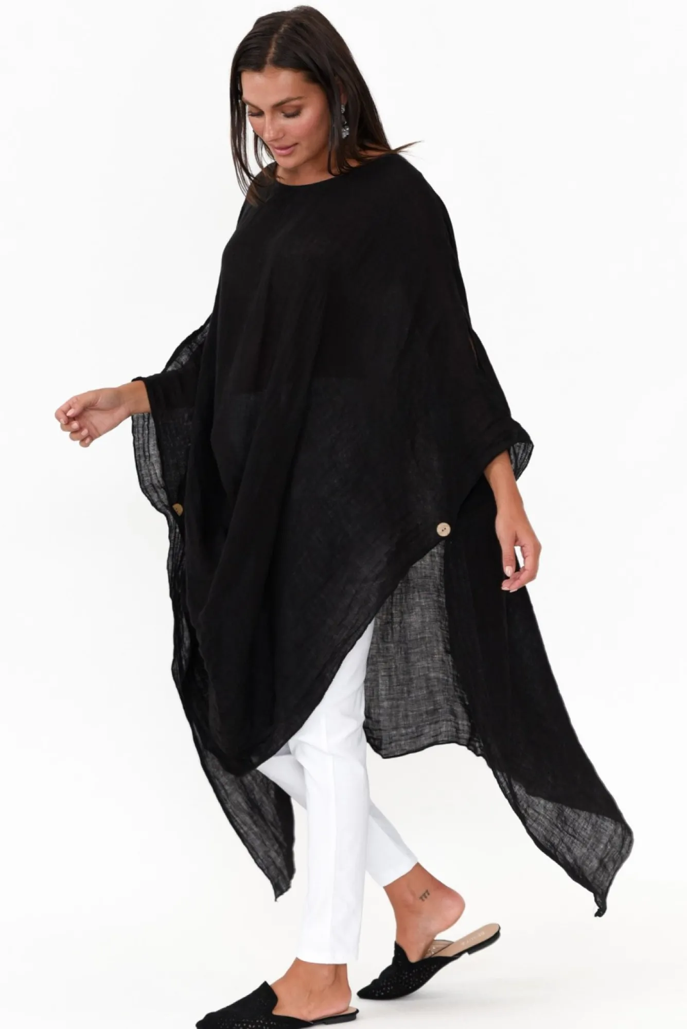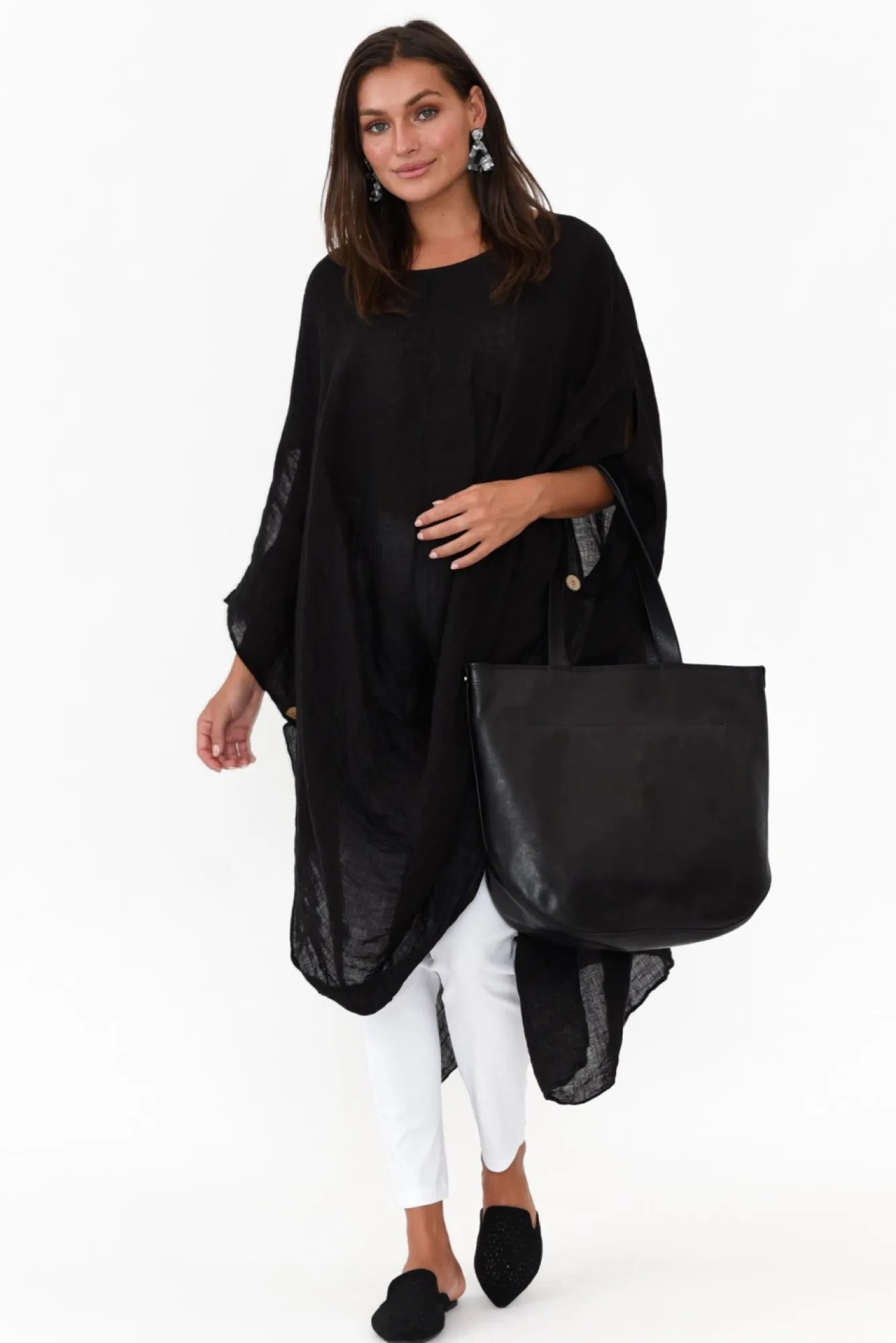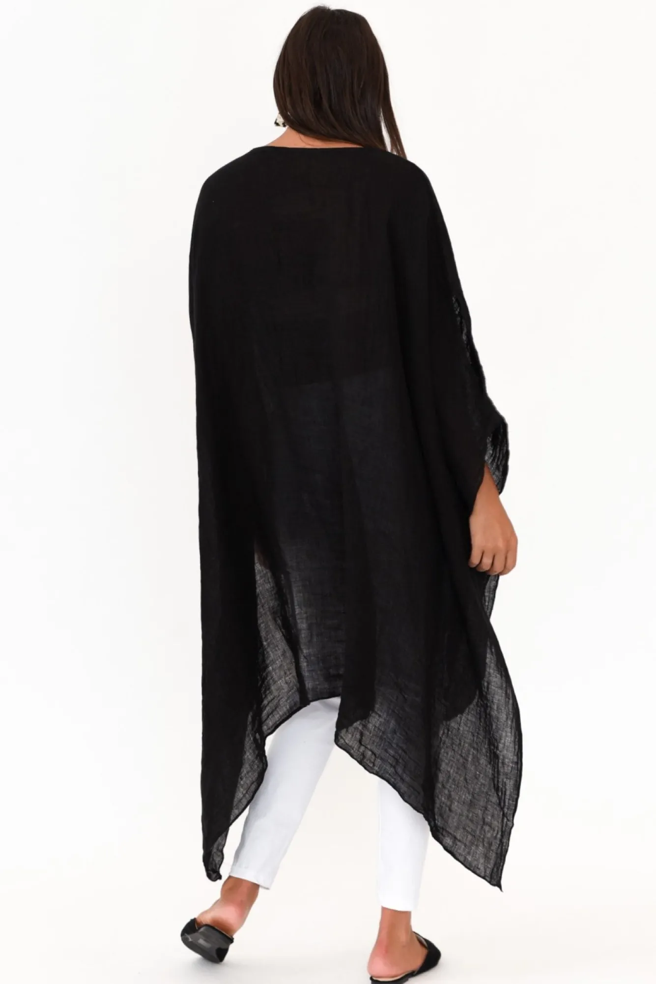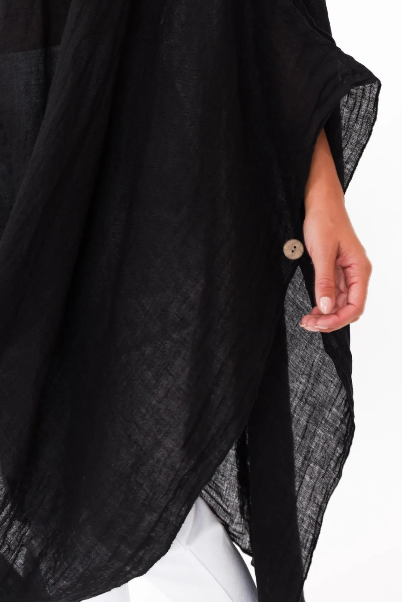 Fit: Oversized Fit. Refer To Size & Fit Tab Below For Specific Size RecommendationNNfabric: 100% LinenNhandcrafted In Italy From Luxurious Lightweight, Breathable And Non-Stretch Linen With A Classic Slub TextureNwide Boatneck Style NecklineNNdramatic Drape Sleeves With Wooden Button DetailNwear As 3/4 Sleeves With Cold Shoulder Detail Or As Short SleeveNrelaxed Drape Silhouette With Feature Draping That Cascades Down The FrontNasymmetric Hi-Lo Hemline Falls Below Knee LengthNNNcare: Cool Gentle Machine Wash RecommendedNNcolour: Timeless Black NNstyle Tip: This Fabric Is Partially Sheer. Pair With Your Favourite Camisole For Added Comfort Or Use As Beach Throw-Over.
