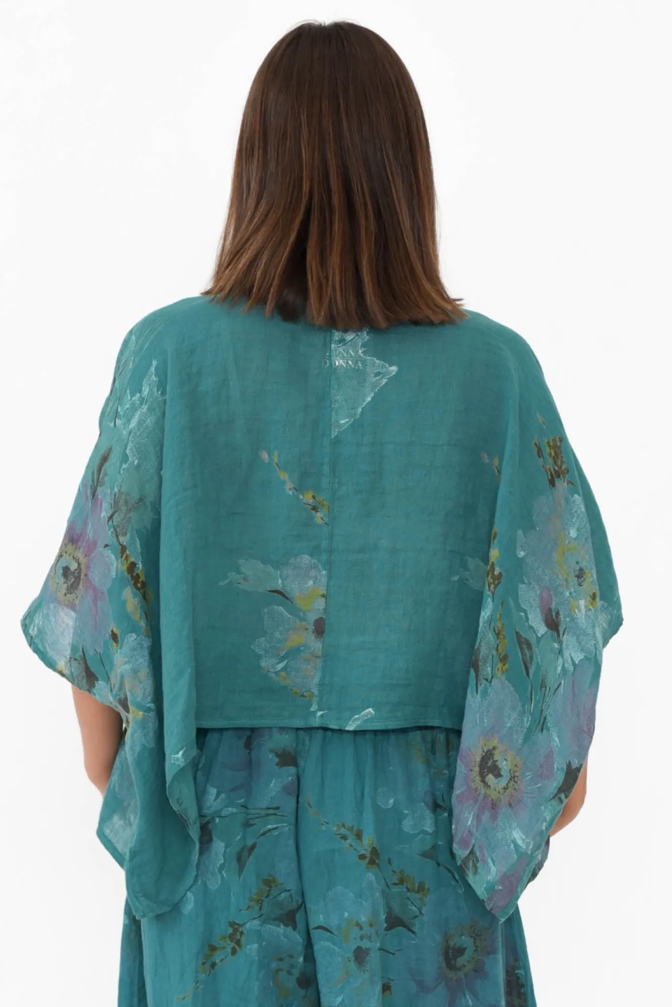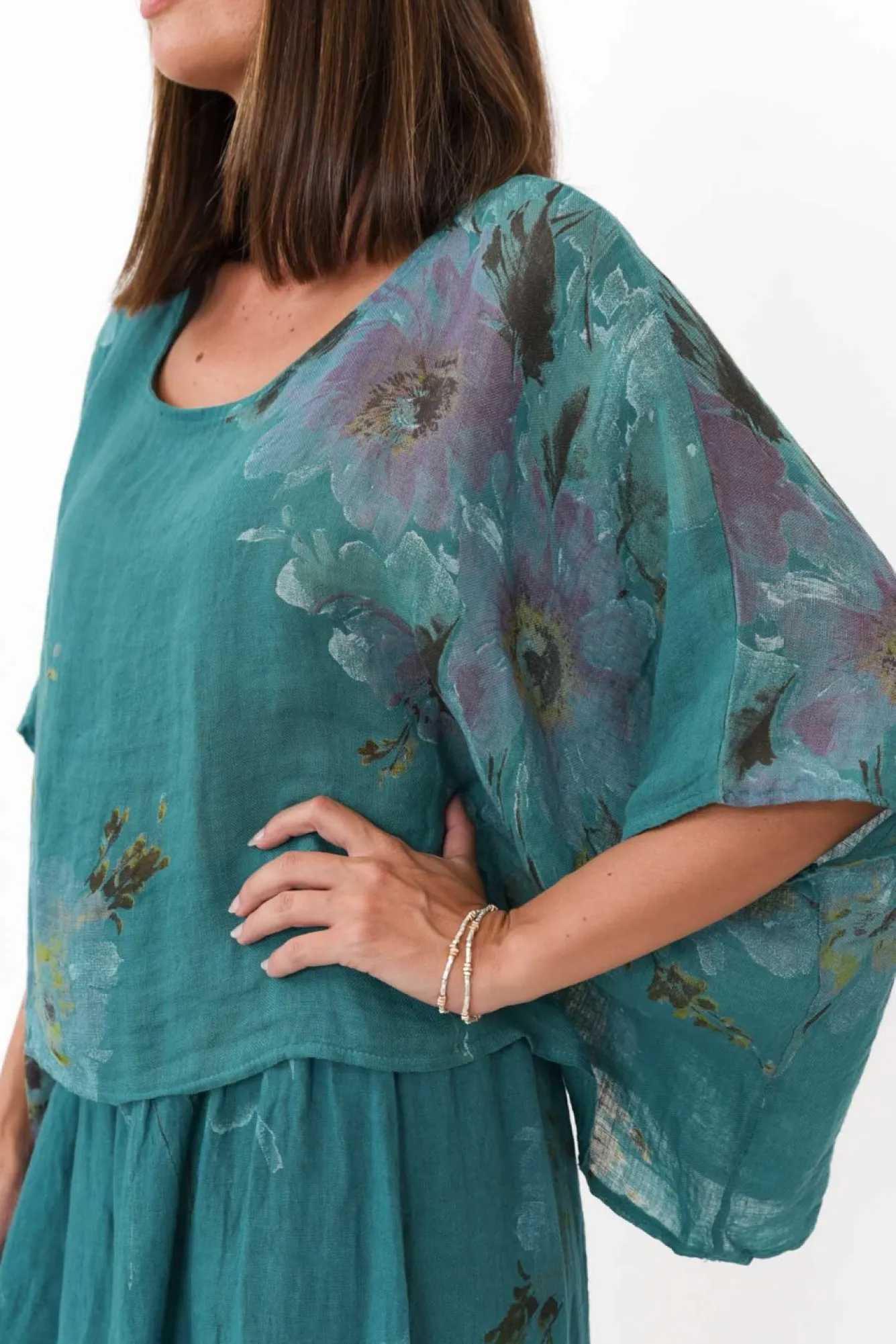 Linen Tops<Donna Donna Turner Teal Floral Linen Scoop Neck Top