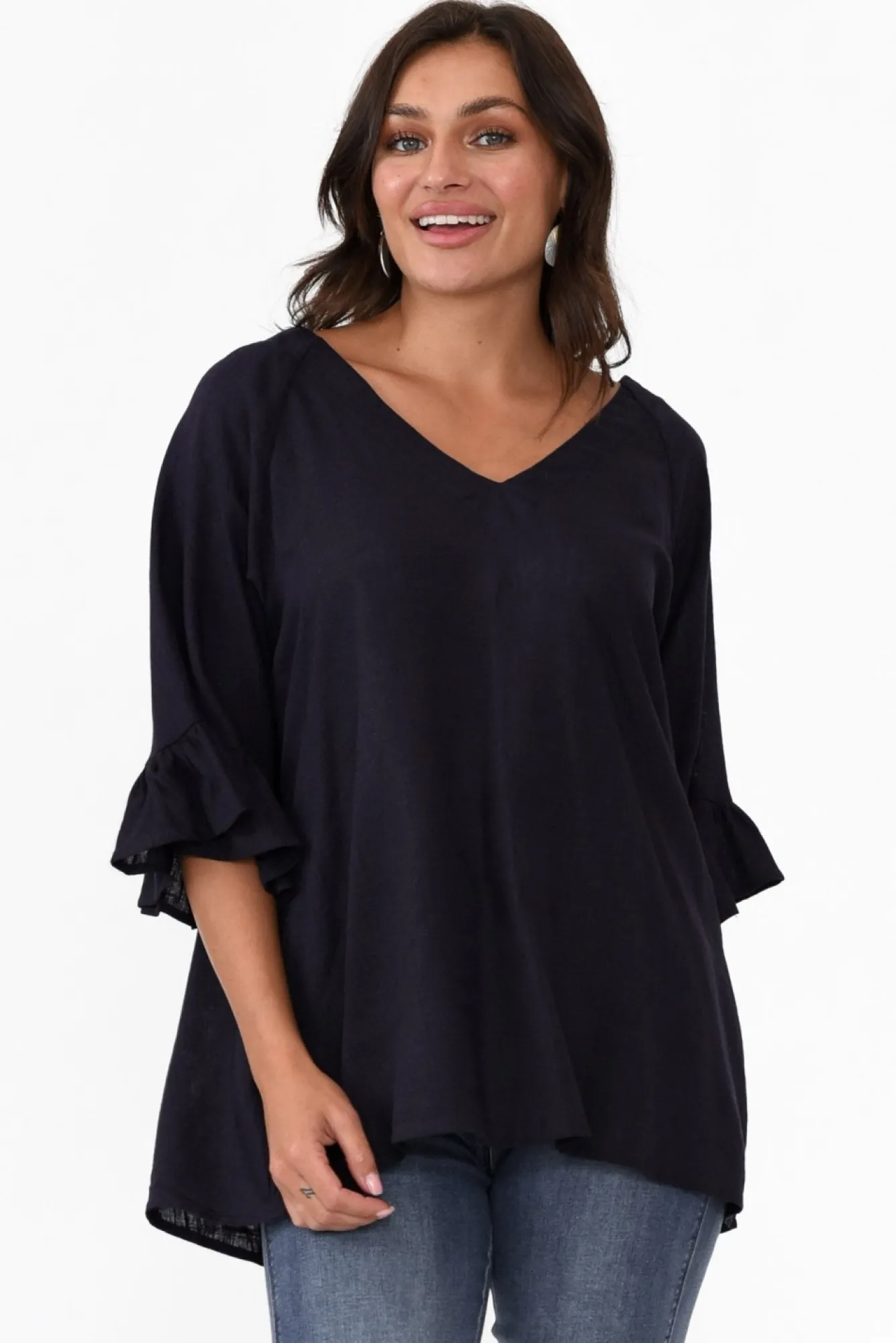 Fit: True To Size. Refer To Size & Fit Tab Below For Specific Size RecommendationNNfabric: 65% Linen, 35% CottonNa Lightweight And Breathable Linen Cotton Blend Top With A Subtle Woven FeelNNsimple V-Neckline Complements The CollarbonesNNdesigned With Half-Length, Flared Sleeves With Dramatic Frill DetailNNclassic A-Line SilhouetteNfeaturing A Subtle Hi-Lo Hemline That Drapes To The HipNNcare: Cool Gentle Hand Wash RecommendedNNcolour: Washed Navy Shade