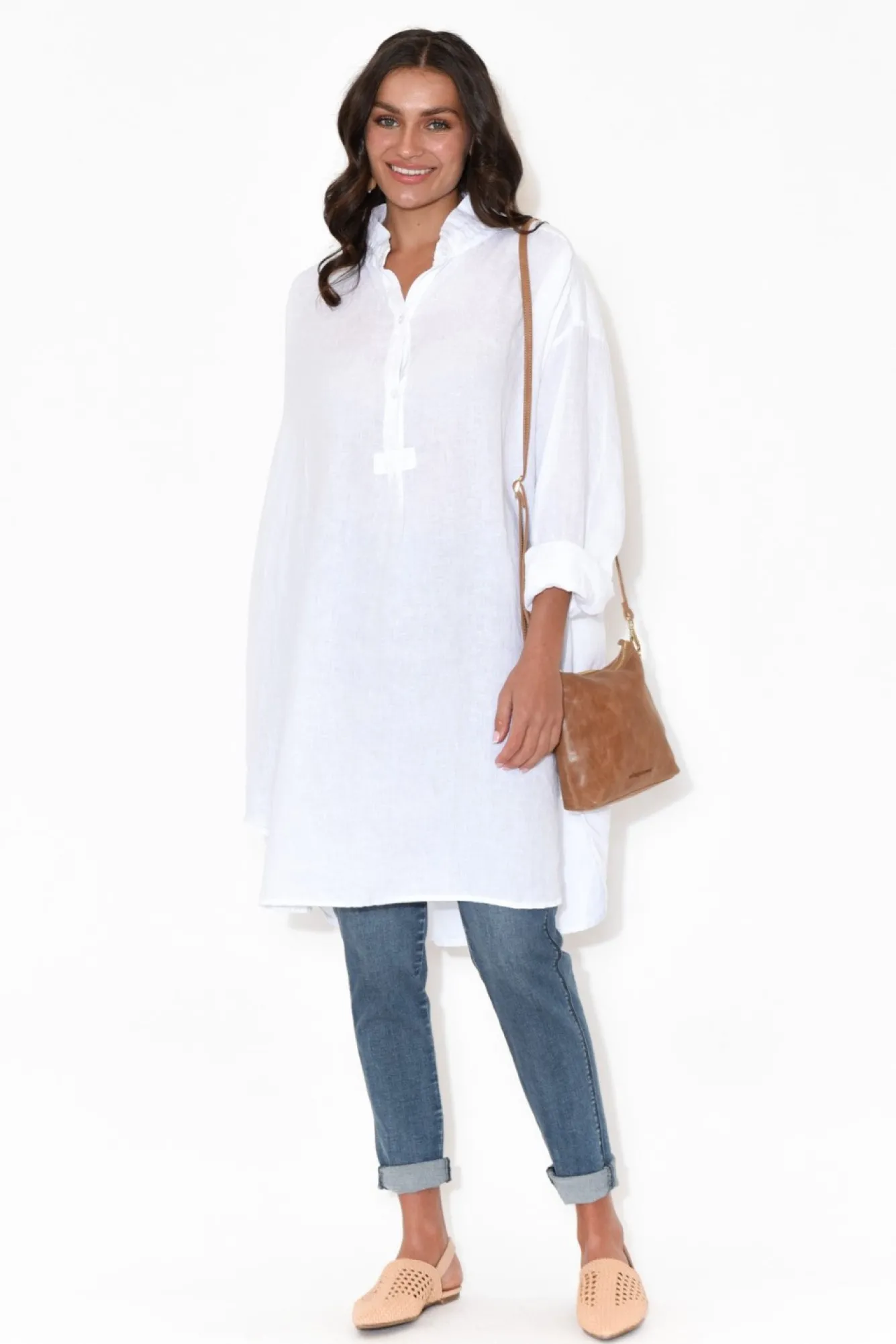 Fit: True To Size. Oversized Fit. Refer To Size & Fit Tab Below For Specific Size Recommendation NNfabric: 100% LinenNstunning Lightweight, Breathable And No-Stretch FabricNlovely Collared Neckline With Cascading Buttons Down BustNNfull Length Sleeves With Button Cuff Detail NNfloaty Tunic Silhouette Drapes Beautifully Down The Body – Perfect For Layering Over Pants NNtwo Discreet Hip PocketsNhi-Low Hemline Falls To Mid Thigh NNNcare: Cool Gentle Hand Wash RecommendedNNcolour: Crisp White