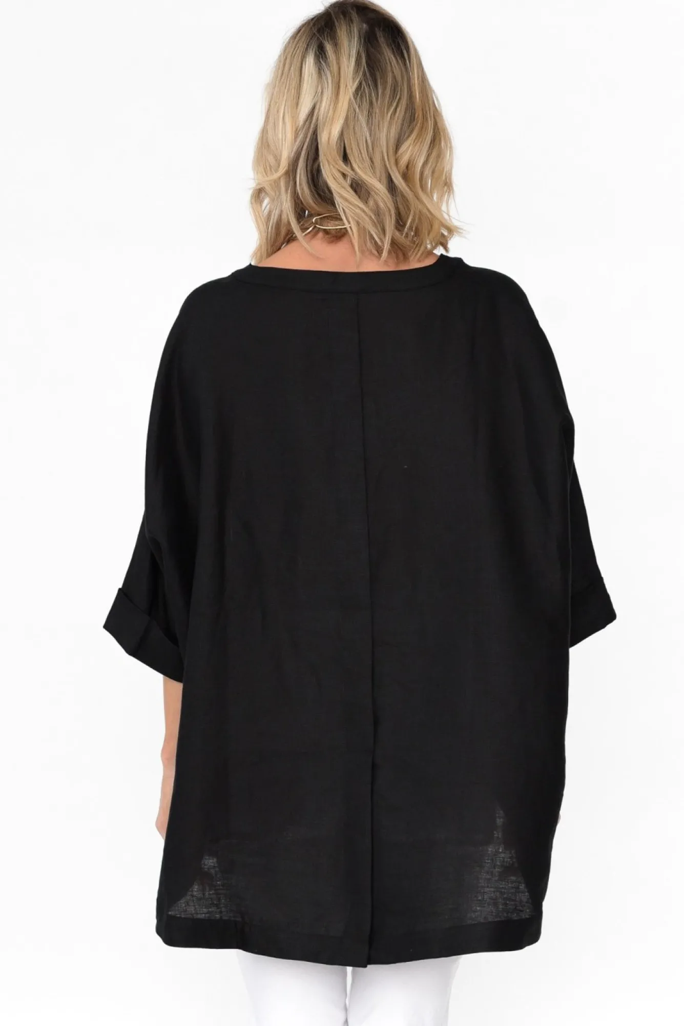 Fit: True To Size. Refer To Size & Fit Tab Below For Specific Size RecommendationNNfabric: 100% Linen Ntightly Woven Linen Offering A Breathable And Lightweight Feel NNtimeless Banded Round NeckNthree-Quarter Length Oversized Sleeve Features A Drop ShoulderNNstraight Silhouette Drapes Over CurvesNNelevated Pleat Detail On The Back Ncurved Hi-Lo Hem Provides More Coverage At The BackNNcare: Cool Gentle Machine Wash RecommendedNNNcolour: Classic Black