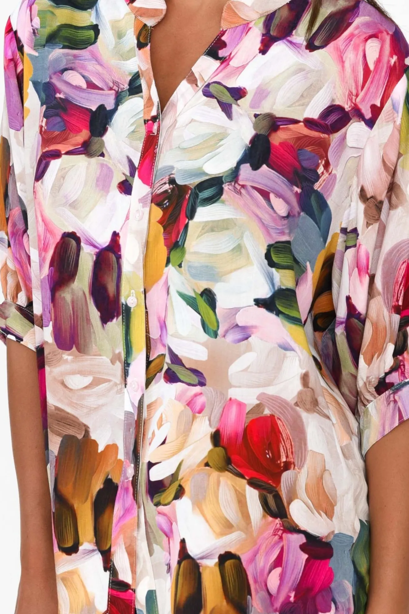 Fit: True To Size. Refer To Size & Fit Tab Below For Specific Size RecommendationNNfabric: Viscose/LinenNbreezy, Lightweight And Non-Stretch Linen Blend Fabric Designed With A Soft Hand Feel NNbanded Collar Neckline Leads To A Button-Down Front NNstatement Half-Length Puff Sleeves With A Button Cuff NNrelaxed Straight Silhouette NNhi-Lo Hemline Falls To A Comfortable Hip Length NNNcare: Cool Gentle Hand Wash RecommendedNNcolour: Abstract Flower Print In Shades Of Pink
