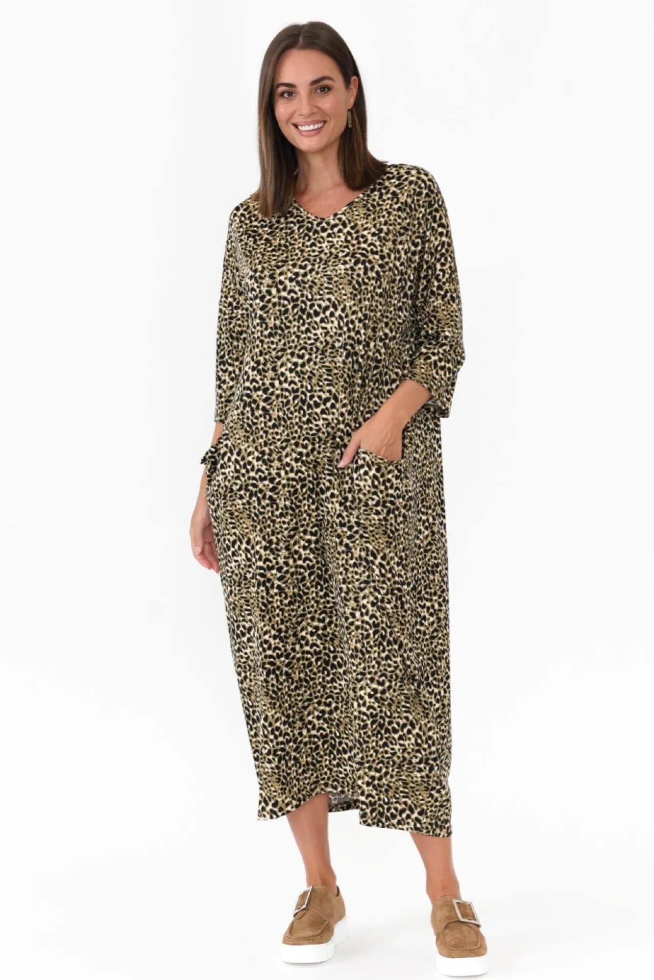 Maxi Dresses<Cotton Village Kenna Khaki Leopard Pocket Dress