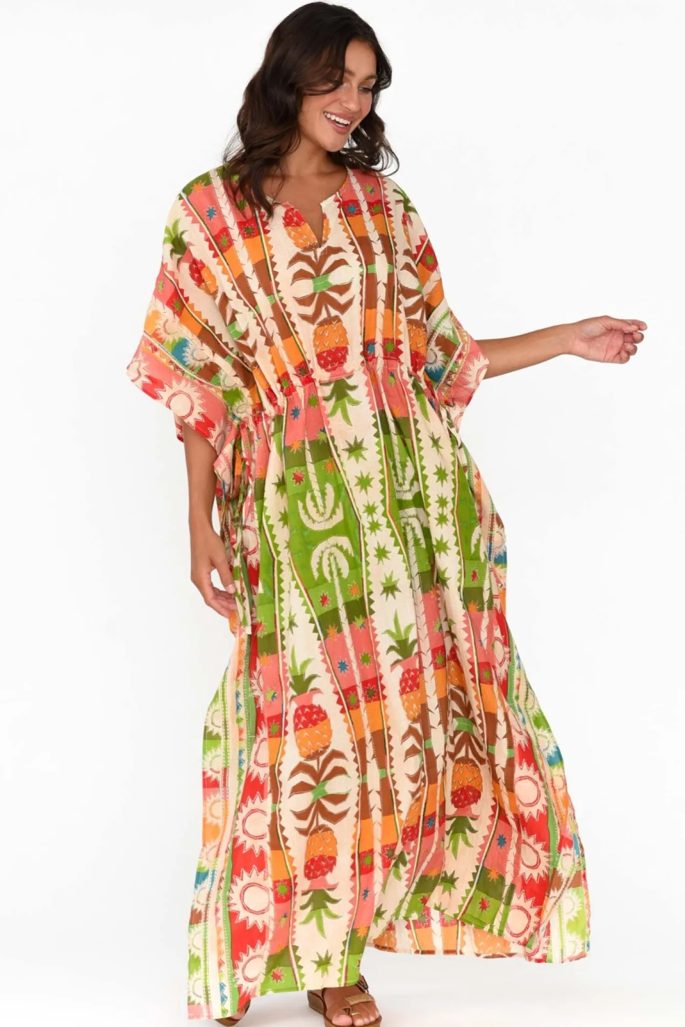 Fit: True To Size. Refer To Size & Fit Tab Below For Specific Size RecommendationNNfabric: 100% Cotton Nultra-Lightweight And Naturally Breathable Cotton With A Smooth, Crisp Hand FeelNround Neckline With A V-Split NNclassic Square-Cute, Draping Kaftan Silhouette NNhalf-Length Drape Sleeves Nsewn-In Seams That Run Up The Side Of The Body To Create A Flattering ShapeNadjustable Drawstring Runs Along The Front Of The Waist For A Ruched Effect Nfull Length Falls To The Ankles With Side Splits For Ease Of MovementNNcare: Cool Gentle Machine Wash RecommendedNNcolour: Detailed Tropical-Inspired Print With Bold Red, Green And Yellow Hues