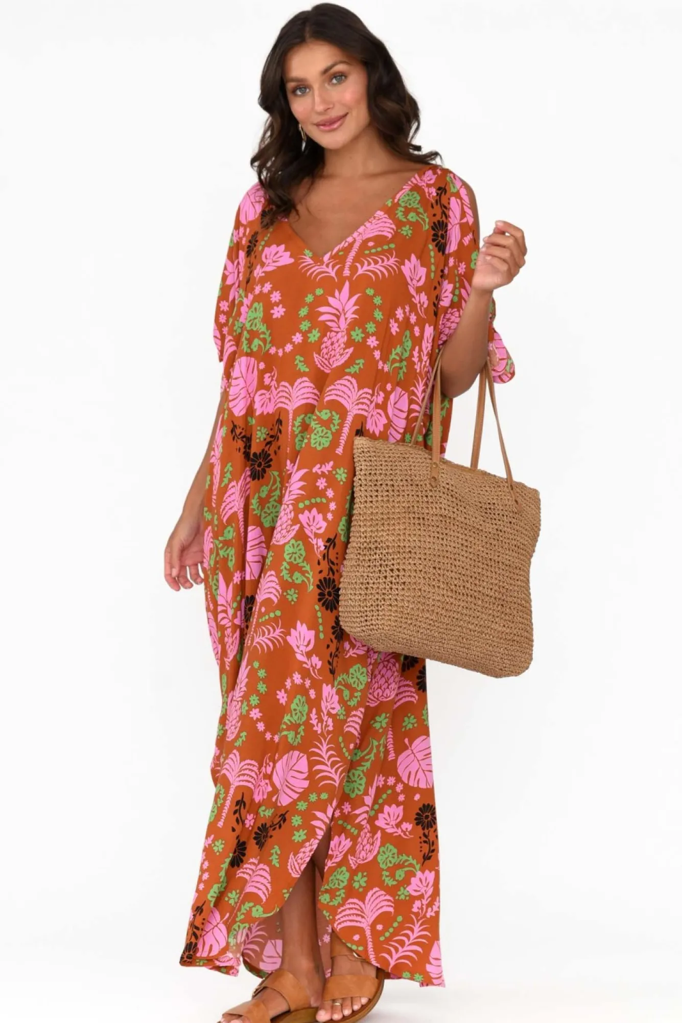 Maxi Dresses<Isabella Boho Marika Rust Tropical Cold Shoulder Kaftan